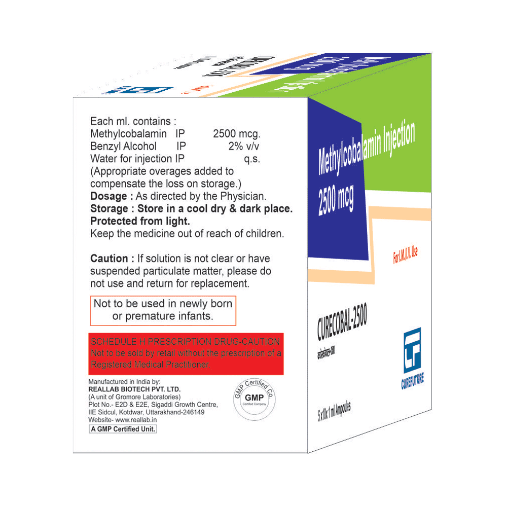 In Vitamin B12 deficiencyCurecobal 2500 Injection is a supplement of vitamin B12. It is used to treat low levels of vitamin B12 in your body. Vitamin B12 is essential in the formation of red blood cells and helps in the absorption of iron in the body. It also helps your body use fat and carbohydrates for energy and make new protein. In combination with other vitamins, it helps in strengthening the immune system, improves the metabolism of the body, and is important for the nervous system.
