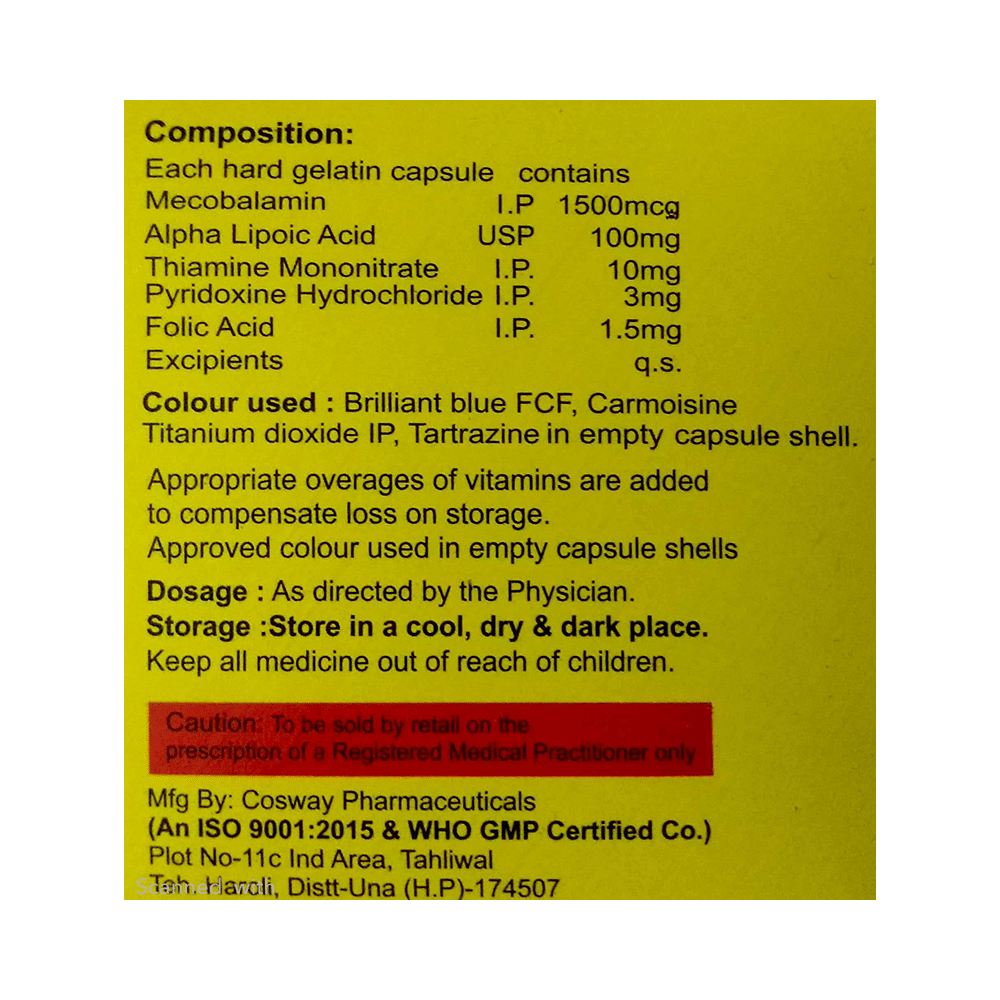 Salt Composition: Methylcobalamin (1500mcg) + Alpha Lipoic Acid (100mg) + Thiamine mononitrate (10mg) + Pyridoxine Hydrochloride (3mg) + Folic Acid (1.5mg)
