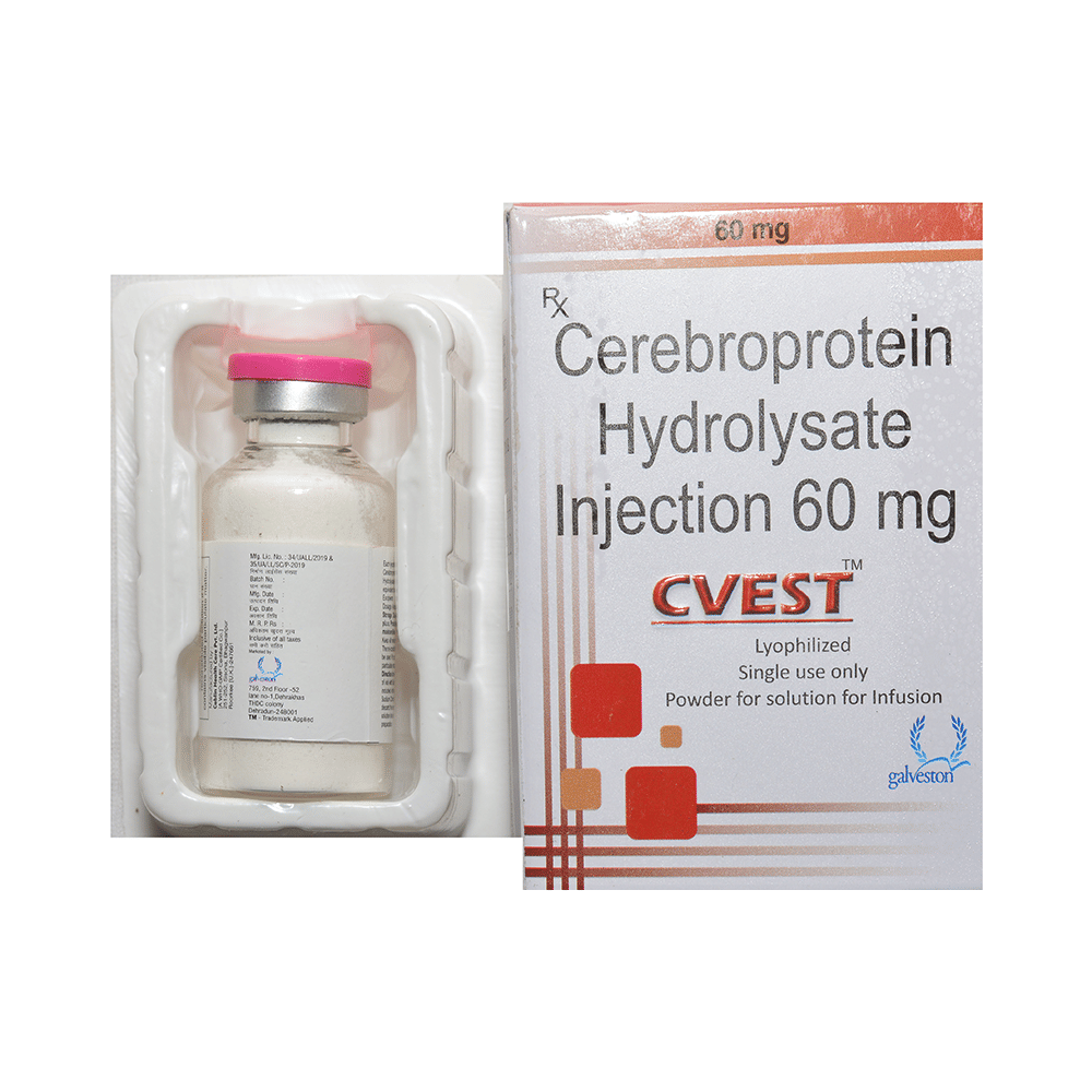 Cvest Injection is a prescription medicine used in the treatment of stroke, head injury, and Alzheimer's disease. It may be used alone or in combination with other medicines, depending on the illness it is being used for. Cvest Injection is given under the supervision of a healthcare professional only. You may take it at the same time each day to maintain consistent level of medicine in the blood. If you miss any dose, take it as soon as you remember. Do not skip any doses and finish the full course of treatment even if you feel better. It is important that this medication is not stopped without talking to doctor. Do not take this medicine if you are suffering from epilepsy or severe kidney problem.It is not known to cause serious side effects but injection site reaction (pain or redness), nausea, headache and vertigo may occur. It may also cause dizziness and sleepiness, so do not drive or do anything that requires mental focus until you know how this medicine affects you.
