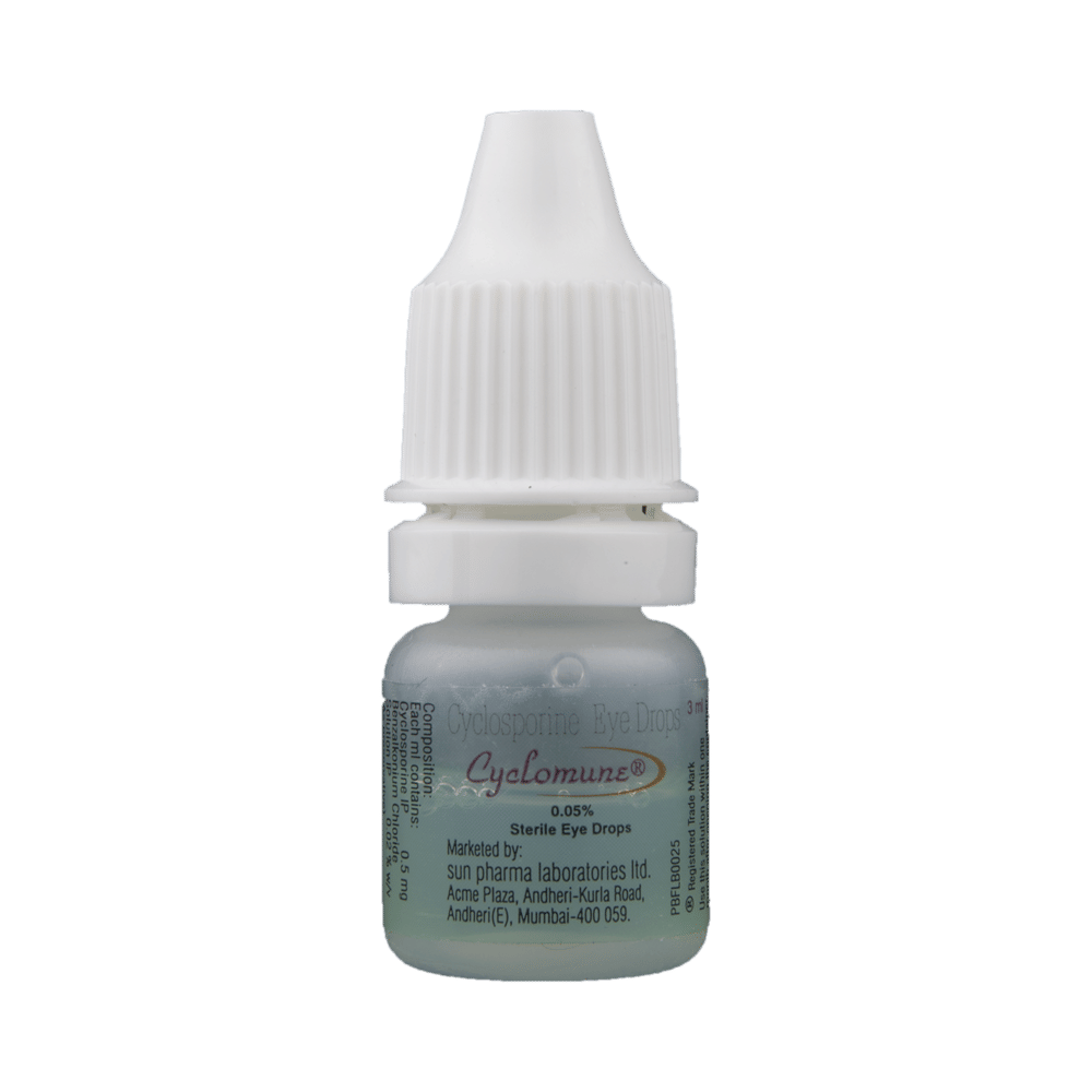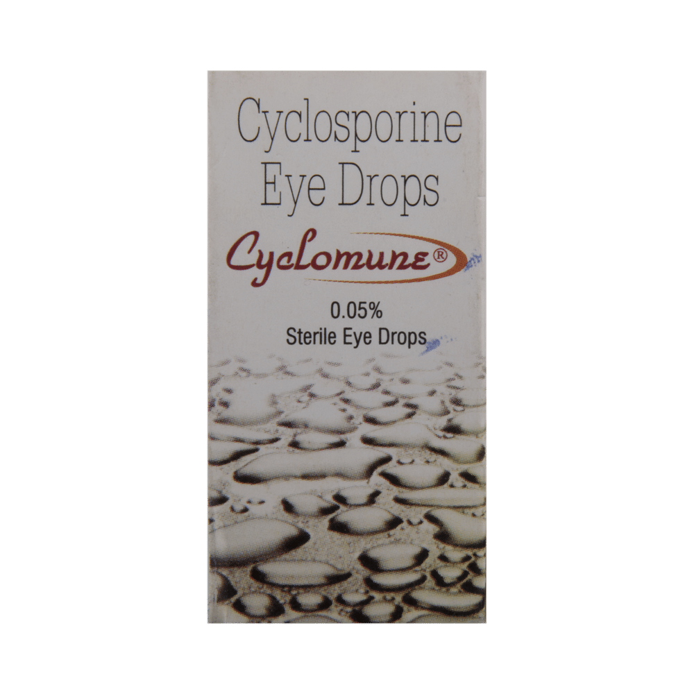 Cyclomune 0.05% Eye Drop is a medicine used for the treatment of dry eyes. It allows for increased tear production by decreasing inflammation (swelling) in the eye. This keeps the eyes lubricated and reduces discomfort. Never use Cyclomune 0.05% Eye Drop if the seal is broken before you use it for the first time. Wash your hands before using it and shake the bottle well before each use. Make sure you remove contact lenses if you wear them and wait for at least 15 minutes before putting them back. It can take several weeks before you notice an improvement in your dry eyes. Keep using it as prescribed.The most common side effects of this medicine are blurred vision and burning sensations in the eyes. If your vision is blurred or you have other changes in sight for a time, do not drive until your vision is clear. This is usually a short-term side effect, inform your doctor if it bothers you.It is not likely that other medicines you take by mouth or injection will affect the way it works. Talk to your doctor before using Cyclomune 0.05% Eye Drop if you have used a similar medicine before and had an allergic reaction. Do not use this medicine if you are pregnant or breastfeeding.