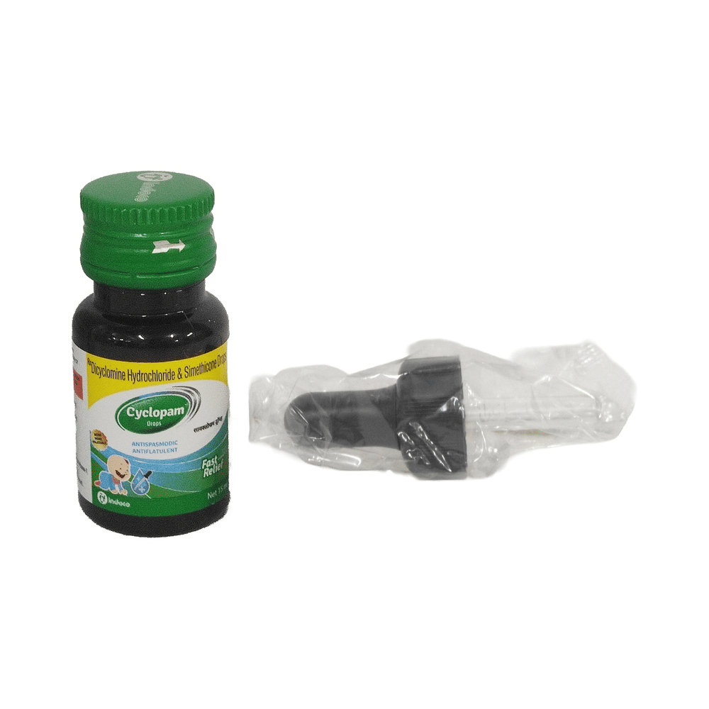 Cyclopam Oral Drops is a mixture of two active medicines Dicyclomine, an antispasmodic agent, and Simethicone, an antifoaming medicine. Dicyclomine works by relaxing the muscles in your stomach and gut (intestine). It stops sudden muscle contractions (spasms), thereby relieving abdominal cramps and pain. Whereas, Simethicone disintegrates gas bubbles and allows easy passage of gas.