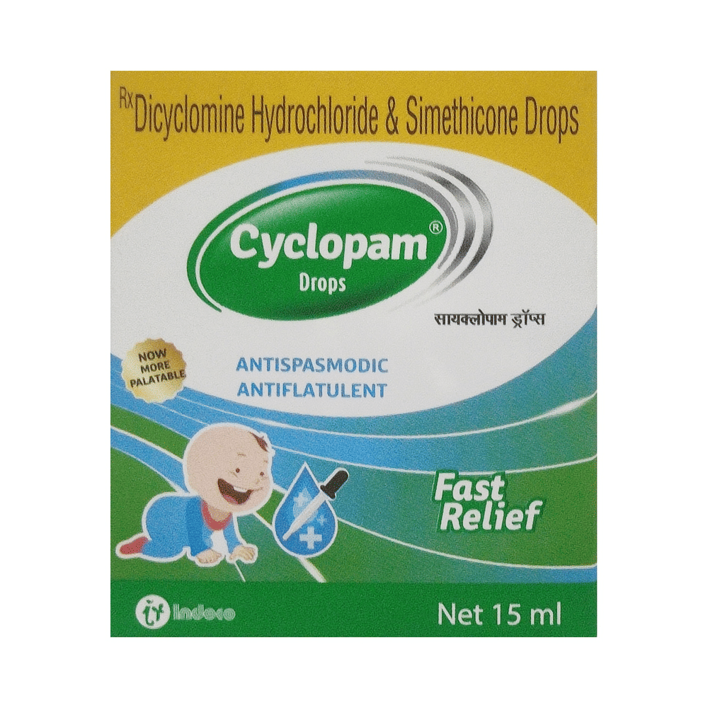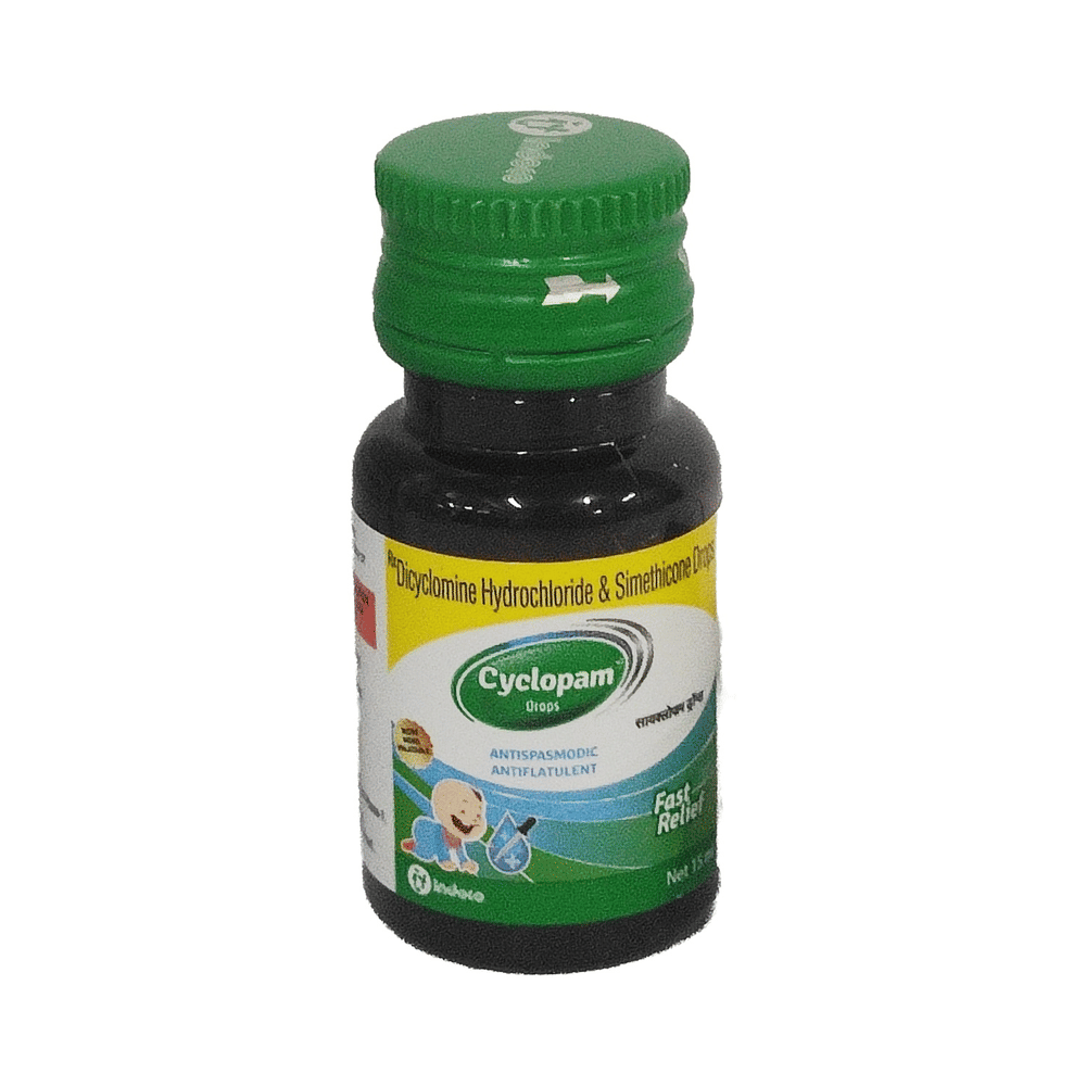 Cyclopam Oral Drops is commonly given to treat stomach pain, bloating, and abdominal cramps, and pain associated with excessive acidity, gas, infections, and gastrointestinal tract diseases. It also controls symptoms of irritable bowel syndrome. It relaxes the muscles of the gut and absorbs the extra gas. Give the prescribed dose of Cyclopam Oral Drops to your child orally before a meal or as suggested by the doctor. Your child’s doctor may prescribe this medicine for a few days to many days. But, do not continue it for more than 2 weeks without consulting the doctor as excessive and long-term use may have adverse effects on your child. Additionally, do not abruptly stop the medicine by yourself as it may bring back the symptoms or worsen your child’s condition.Some of the common yet temporary side effects of this medicine include nausea, vomiting, constipation, burping, vision problem, loss of appetite, and drowsiness. These usually subside once your child’s body adapts to the medicine. However, if these side effects persist or become bothersome for your child, do reach out to the doctor on a priority basis.You must let your child’s doctor know about all the medicines your child is being given. Also, inform the doctor of any previous history of allergy, intolerance to any food products, abdominal obstruction, liver impairment, kidney malfunction, or any birth defects, This information is very important for dose alterations and for planning your child’s overall treatment.