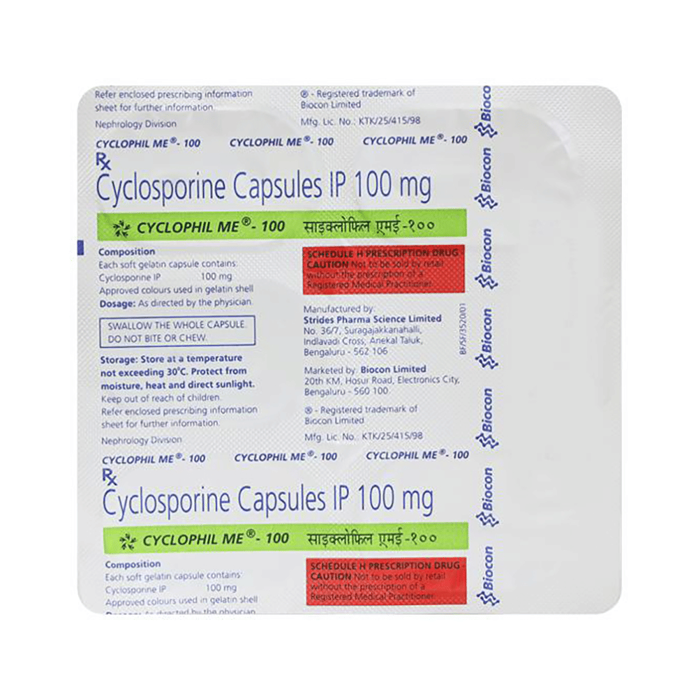 In Treatment of PsoriasisCyclophil ME 100 Capsule can be used to treat severe psoriasis when other treatments have not worked or are not appropriate. Psoriasis happens when skin cells are replaced more quickly than usual. This medicine can improve your skin and reduce the symptoms of rash, redness, and pain. The improvement in the appearance of your skin can boost your confidence and improve your life. Psoriasis is a long-term condition. You should keep taking this medicine for as long as it is prescribed.In Prevention of organ rejection in transplant patientsCyclophil ME 100 Capsule belongs to a group of medicines known as immunosuppressive agents. It lowers your immune response and reduces the chance of your body attacking the transplanted organ. Organ rejection happens when your immune system treats the new organ as an invader and attacks it. This medicine suppresses the immune system and helps your body accept the new organ as if it were your own.In Treatment of Nephrotic syndromeNephrotic syndrome is a kidney disorder that causes your body to pass too much protein in your urine accompanied with excessive swelling over various parts of the body such as around the eyes and in the feet and ankles. Cyclophil ME 100 Capsule works by suppressing the immune system thereby reducing inflammation and swelling that occur in nephrotic syndrome. It reduces the protein in the urine and also helps in getting rid of the extra fluid, thereby relieving the swelling over different parts of the body. This helps to restore the normal kidney function and prevents further damage to the kidneys.show moreshow less