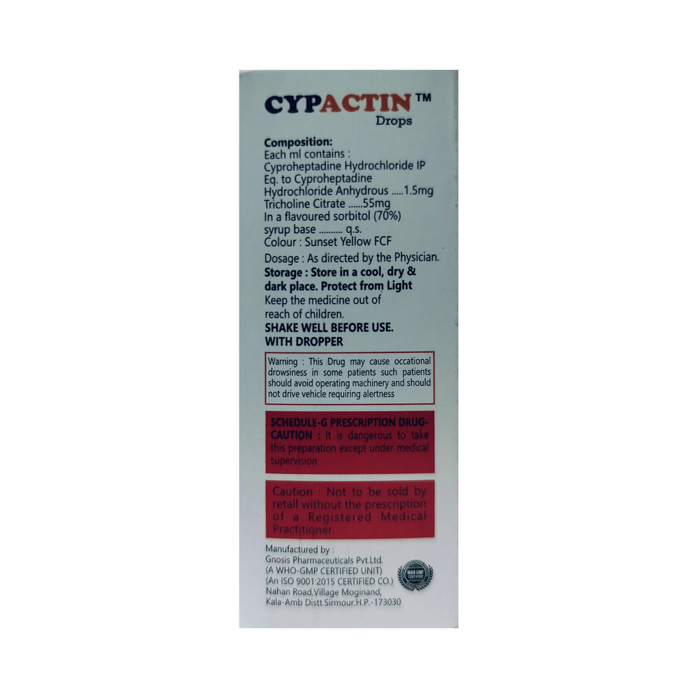 Take this medicine in the dose and duration as advised by your doctor. Check the label for directions before use. Measure it with a marked dropper and take it as directed. Cypactin Oral Drops Orange may be taken with or without food, but it is better to take it at a fixed time.