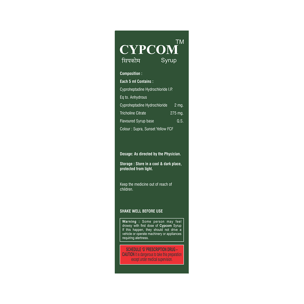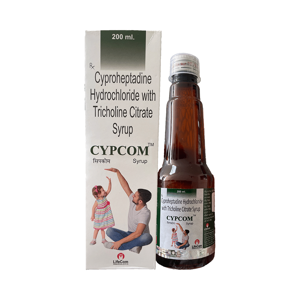 Cypcom Syrup is a combination medicine used to treat loss of appetite. It is an effective appetite stimulant. It works by reducing the effect of a chemical messenger which regulates appetite. Cypcom Syrup is taken with or without food in a dose and duration as advised by the doctor. The dose you are given will depend on your condition and how you respond to the medicine. You should keep taking this medicine for as long as your doctor recommends. Let your healthcare team know about all other medications you are taking as some may affect, or be affected by this medicine.The most common side effects are constipation, dryness in mouth, and blurred vision. Most of these are temporary and usually resolve with time. Contact your doctor straight away if you are at all concerned about any of these side effects. It can cause dizziness, so do not drive or do anything that requires mental focus until you know how this medicine affects you. Avoid drinking alcohol while taking this medicine as it can worsen your sleepiness.Never support self-medication or recommend your medicine to another person. Before taking it, you should tell your doctor if you have any kidney or liver diseases so that your doctor can prescribe a suitable dose for you. Pregnant or breastfeeding women should also consult their doctor.