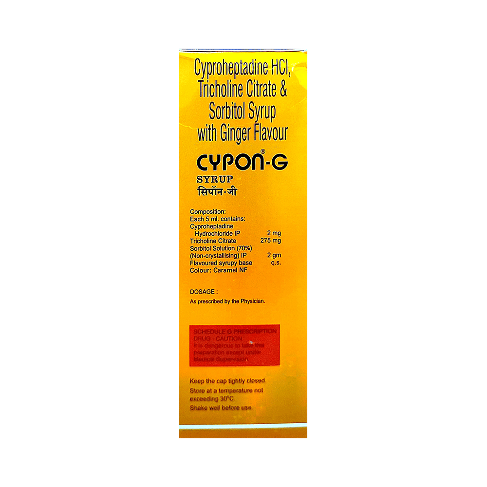 Cypon G Syrup Ginger is a combination medicine used to treat loss of appetite. It is an effective appetite stimulant. It works by reducing the effect of a chemical messenger which regulates appetite. Cypon G Syrup Ginger is taken with or without food in a dose and duration as advised by the doctor. The dose you are given will depend on your condition and how you respond to the medicine. You should keep taking this medicine for as long as your doctor recommends. Let your healthcare team know about all other medications you are taking as some may affect, or be affected by this medicine.The most common side effects are constipation, dryness in the mouth, and blurred vision. Most of these are temporary and usually resolve with time. Contact your doctor straight away if you are concerned about any of these. It can cause dizziness, so do not drive or do anything that requires mental focus until you know how this medicine affects you. Avoid drinking alcohol while taking this medicine as it can worsen your sleepiness.Before taking Cypon G Syrup Ginger, inform your doctor if you have any kidney or liver diseases so that your doctor can prescribe a suitable dose for you. Pregnant or breastfeeding women should also consult their doctor before taking this medicine.