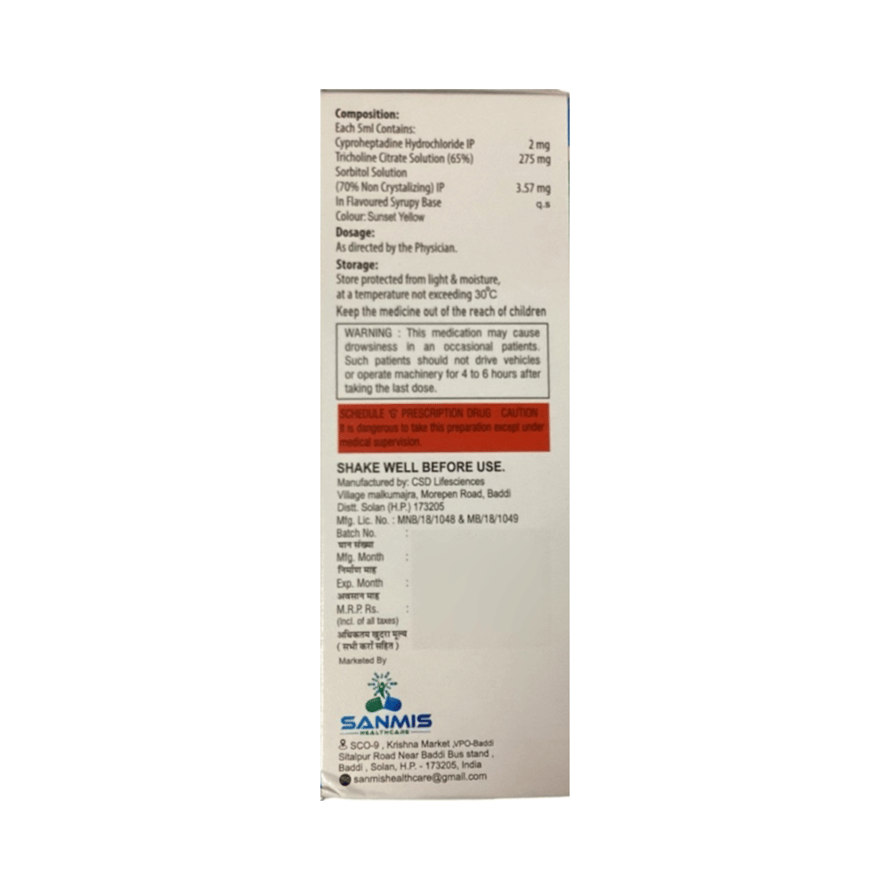 Salt Composition: Cyproheptadine (2mg/5ml) + Tricholine Citrate (275mg/5ml) + Sorbitol (3.57mg/5ml)