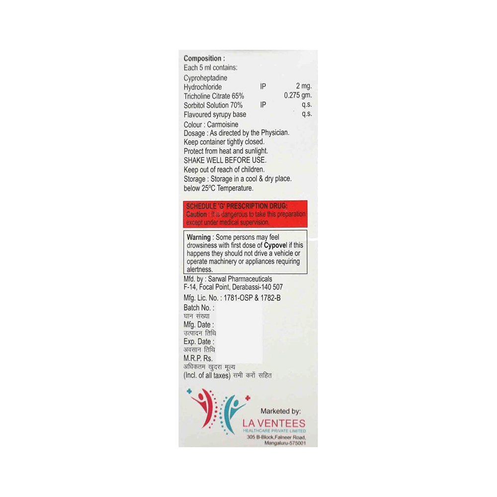 Cypovel Syrup Mixed Fruit is a combination medicine used to treat loss of appetite. It is an effective appetite stimulant. It works by reducing the effect of a chemical messenger which regulates appetite. Cypovel Syrup Mixed Fruit is taken with or without food in a dose and duration as advised by the doctor. The dose you are given will depend on your condition and how you respond to the medicine. You should keep taking this medicine for as long as your doctor recommends. Let your healthcare team know about all other medications you are taking as some may affect, or be affected by this medicine.The most common side effects are constipation, dryness in mouth, and blurred vision. Most of these are temporary and usually resolve with time. Contact your doctor straight away if you are at all concerned about any of these side effects. It can cause dizziness, so do not drive or do anything that requires mental focus until you know how this medicine affects you. Avoid drinking alcohol while taking this medicine as it can worsen your sleepiness.Never support self-medication or recommend your medicine to another person. Before taking it, you should tell your doctor if you have any kidney or liver diseases so that your doctor can prescribe a suitable dose for you. Pregnant or breastfeeding women should also consult their doctor.