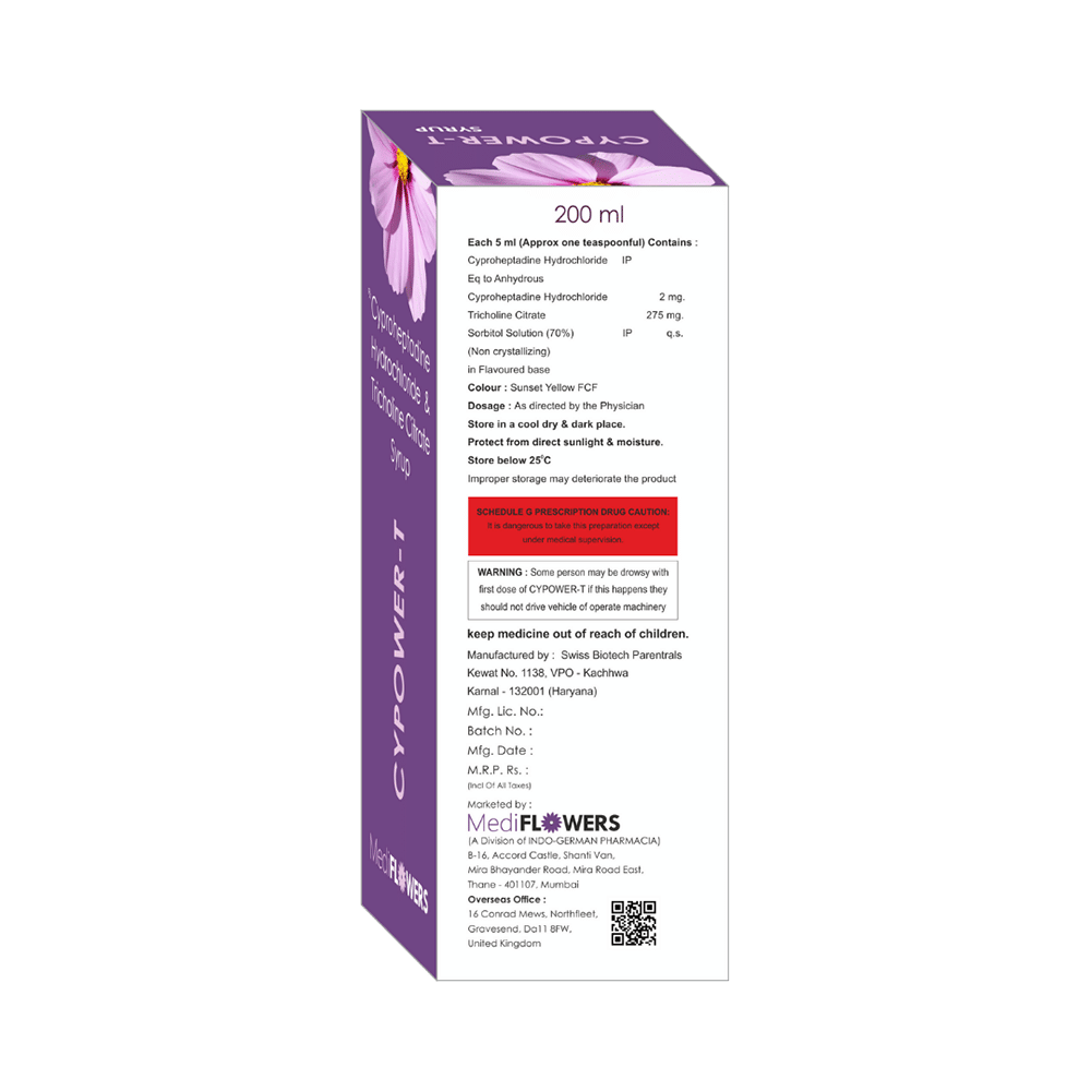 Cypower-T Syrup is a combination medicine used to treat loss of appetite. It is an effective appetite stimulant. It works by reducing the effect of a chemical messenger which regulates appetite. Cypower-T Syrup is taken with or without food in a dose and duration as advised by the doctor. The dose you are given will depend on your condition and how you respond to the medicine. You should keep taking this medicine for as long as your doctor recommends. Let your healthcare team know about all other medications you are taking as some may affect, or be affected by this medicine.The most common side effects are constipation, dryness in mouth, and blurred vision. Most of these are temporary and usually resolve with time. Contact your doctor straight away if you are at all concerned about any of these side effects. It can cause dizziness, so do not drive or do anything that requires mental focus until you know how this medicine affects you. Avoid drinking alcohol while taking this medicine as it can worsen your sleepiness.Never support self-medication or recommend your medicine to another person. Before taking it, you should tell your doctor if you have any kidney or liver diseases so that your doctor can prescribe a suitable dose for you. Pregnant or breastfeeding women should also consult their doctor.