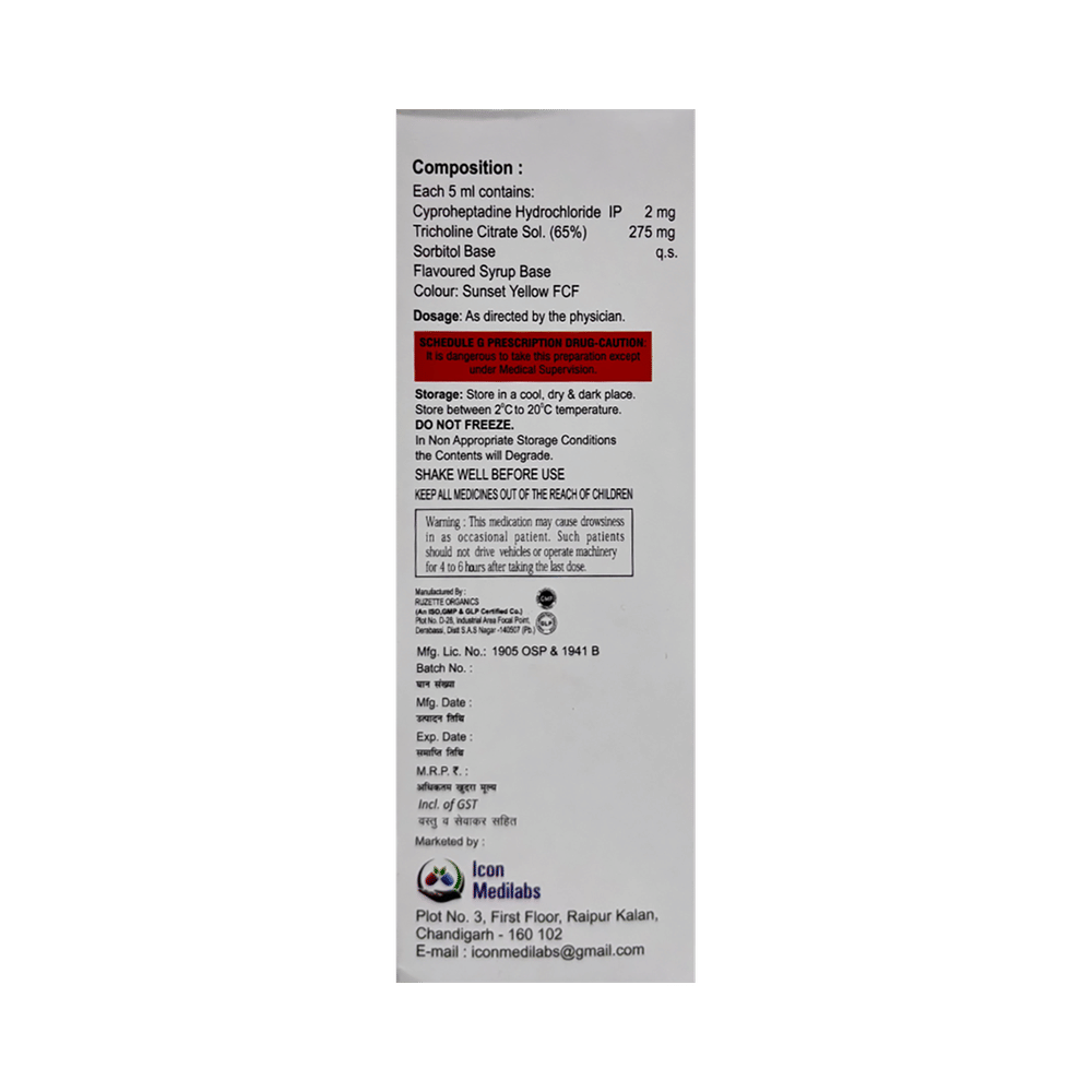 Salt Composition: Cyproheptadine (2mg/5ml) + Tricholine Citrate (275mg/5ml)