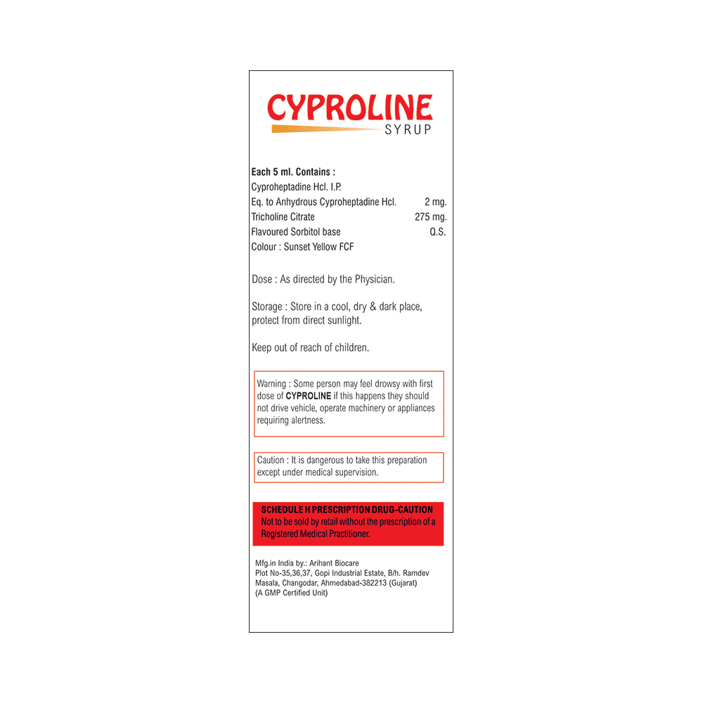 Cyproline Syrup Sugar Free is a combination medicine used to treat loss of appetite. It is an effective appetite stimulant. It works by reducing the effect of a chemical messenger which regulates appetite. Cyproline Syrup Sugar Free is taken with or without food in a dose and duration as advised by the doctor. The dose you are given will depend on your condition and how you respond to the medicine. You should keep taking this medicine for as long as your doctor recommends. Let your healthcare team know about all other medications you are taking as some may affect, or be affected by this medicine.The most common side effects are constipation, dryness in mouth, and blurred vision. Most of these are temporary and usually resolve with time. Contact your doctor straight away if you are at all concerned about any of these side effects. It can cause dizziness, so do not drive or do anything that requires mental focus until you know how this medicine affects you. Avoid drinking alcohol while taking this medicine as it can worsen your sleepiness.Never support self-medication or recommend your medicine to another person. Before taking it, you should tell your doctor if you have any kidney or liver diseases so that your doctor can prescribe a suitable dose for you. Pregnant or breastfeeding women should also consult their doctor.