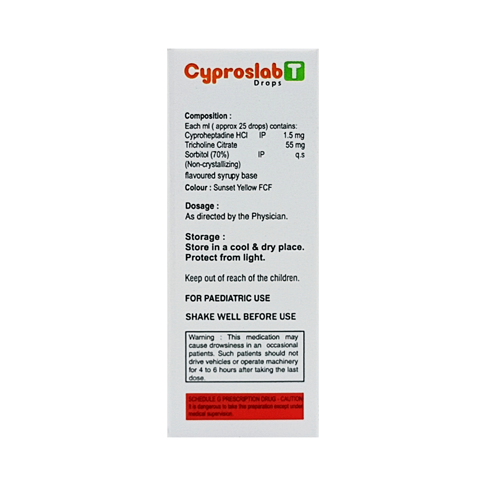 Cyproslab T Drop is a combination medicine used to treat loss of appetite. It is an effective appetite stimulant. It works by reducing the effect of a chemical messenger which regulates appetite. Cyproslab T Drop is taken with or without food in a dose and duration as advised by the doctor. The dose you are given will depend on your condition and how you respond to the medicine. You should keep taking this medicine for as long as your doctor recommends. Let your healthcare team know about all other medications you are taking as some may affect, or be affected by this medicine.The most common side effects are constipation, dryness in the mouth, and blurred vision. Most of these are temporary and usually resolve with time. Contact your doctor straight away if you are concerned about any of these. It can cause dizziness, so do not drive or do anything that requires mental focus until you know how this medicine affects you. Avoid drinking alcohol while taking this medicine as it can worsen your sleepiness.Before taking Cyproslab T Drop, inform your doctor if you have any kidney or liver diseases so that your doctor can prescribe a suitable dose for you. Pregnant or breastfeeding women should also consult their doctor before taking this medicine.