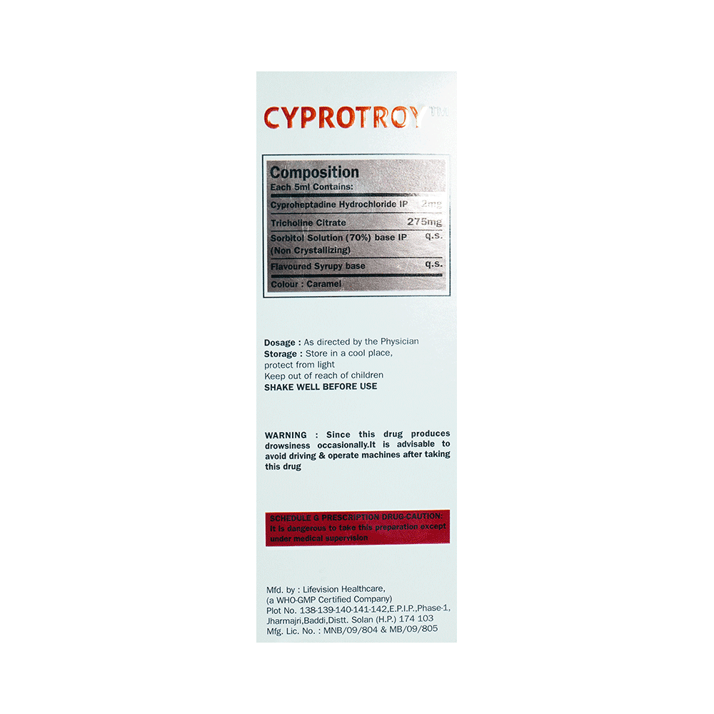 Cyprotroy Syrup is a combination medicine used to treat loss of appetite. It is an effective appetite stimulant. It works by reducing the effect of a chemical messenger which regulates appetite. Cyprotroy Syrup is taken with or without food in a dose and duration as advised by the doctor. The dose you are given will depend on your condition and how you respond to the medicine. You should keep taking this medicine for as long as your doctor recommends. Let your healthcare team know about all other medications you are taking as some may affect, or be affected by this medicine.The most common side effects are constipation, dryness in mouth, and blurred vision. Most of these are temporary and usually resolve with time. Contact your doctor straight away if you are at all concerned about any of these side effects. It can cause dizziness, so do not drive or do anything that requires mental focus until you know how this medicine affects you. Avoid drinking alcohol while taking this medicine as it can worsen your sleepiness.Never support self-medication or recommend your medicine to another person. Before taking it, you should tell your doctor if you have any kidney or liver diseases so that your doctor can prescribe a suitable dose for you. Pregnant or breastfeeding women should also consult their doctor.