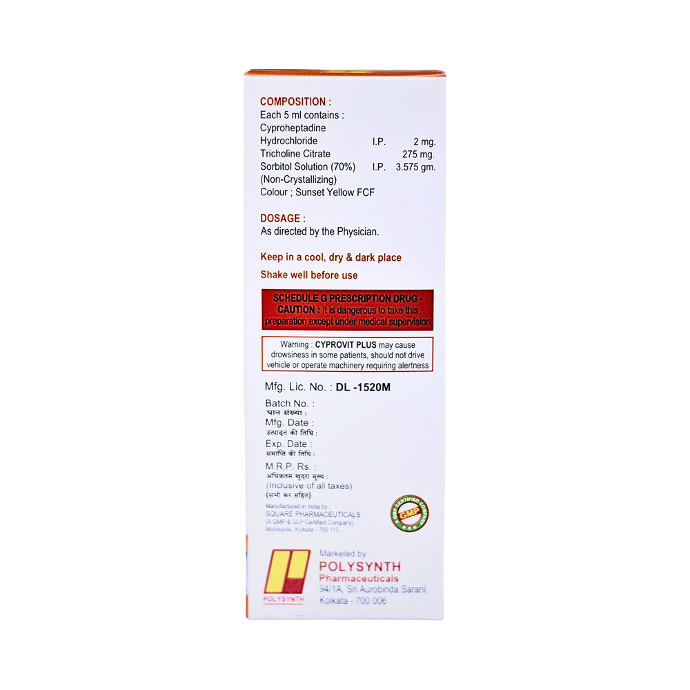 Cyprovit Plus Syrup Sugar Free is a combination medicine used to treat loss of appetite. It is an effective appetite stimulant. It works by reducing the effect of a chemical messenger which regulates appetite. Cyprovit Plus Syrup Sugar Free is taken with or without food in a dose and duration as advised by the doctor. The dose you are given will depend on your condition and how you respond to the medicine. You should keep taking this medicine for as long as your doctor recommends. Let your healthcare team know about all other medications you are taking as some may affect, or be affected by this medicine.The most common side effects are constipation, dryness in the mouth, and blurred vision. Most of these are temporary and usually resolve with time. Contact your doctor straight away if you are concerned about any of these. It can cause dizziness, so do not drive or do anything that requires mental focus until you know how this medicine affects you. Avoid drinking alcohol while taking this medicine as it can worsen your sleepiness.Before taking Cyprovit Plus Syrup Sugar Free, inform your doctor if you have any kidney or liver diseases so that your doctor can prescribe a suitable dose for you. Pregnant or breastfeeding women should also consult their doctor before taking this medicine.