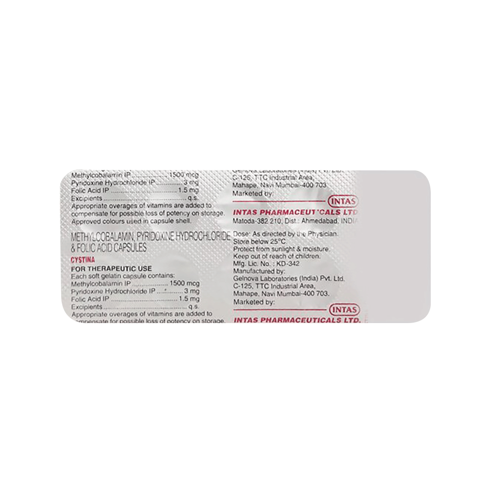 Cystina Capsule is a supplement of vitamin B12. Vitamin B12 is important for the brain and nerves, and for the production of red blood cells. This medicine is used to treat vitamin B12 deficiency. It is also sometimes used in people with pernicious anemia and other conditions. Cystina Capsule should be taken in dosage and duration as advised by the doctor. The dosage should not be exceeded without the consultation of a doctor. Inform your doctor if you are taking any other medicines.Common side effects of this medicine include nausea, vomiting, diarrhea, loss of appetite, and headache. If any of this bothers you, you should let your doctor know. before taking this medicine, let your doctor if you have any preexisting medical condition. Let your doctor also know about all the medicines you are taking.