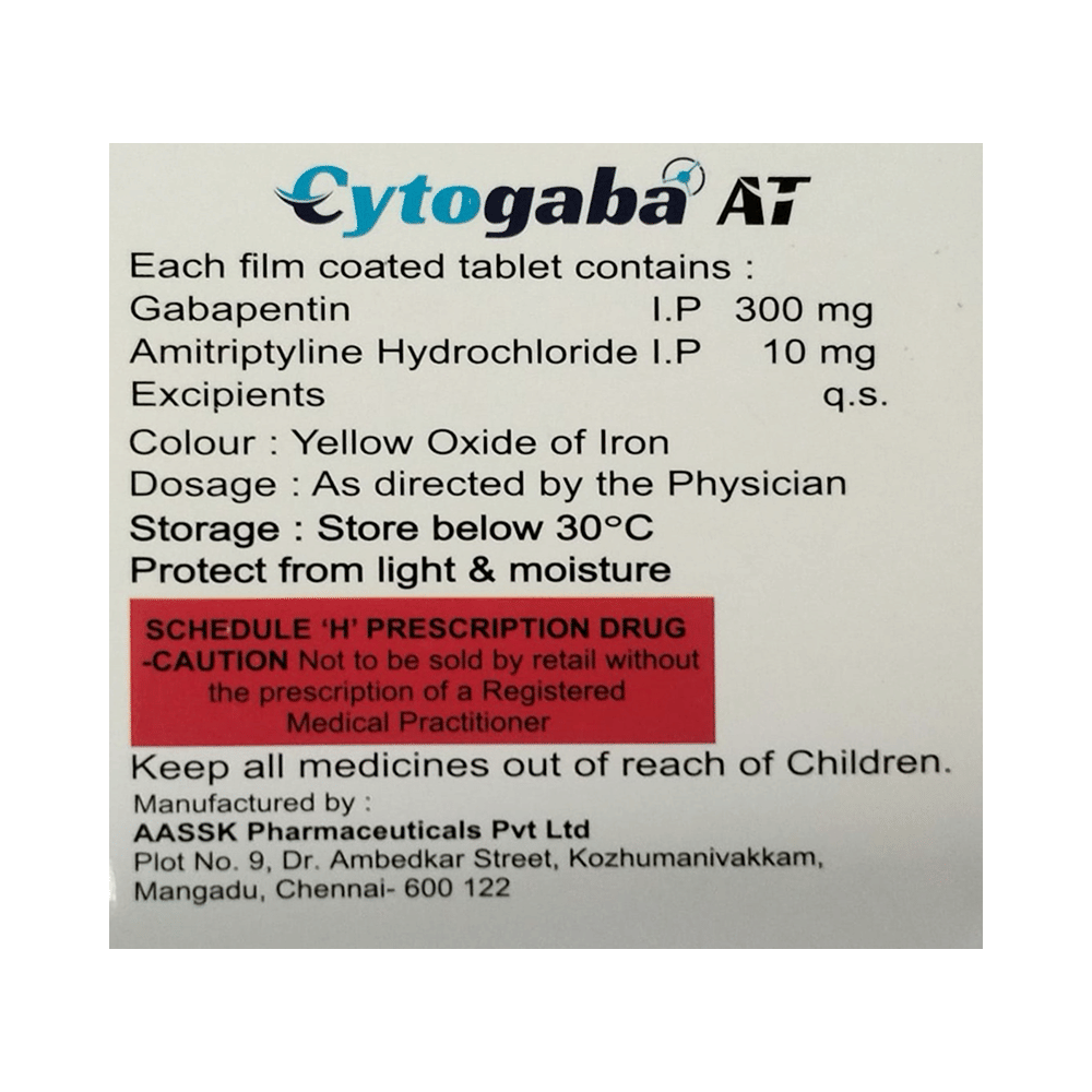 Cytogaba AT Tablet is a combination medicine used for the treatment of neuropathic pain. It works by increasing the level of chemical messengers in the brain. This helps in regulating the mood and stopping the movement of pain signals from nerves to the brain. Cytogaba AT Tablet is taken by mouth with or without food, preferably at bedtime. It is advised to take it at the same time each day as this helps to maintain a consistent level of medicine in the body. Take this medicine in the dose and duration advised by your doctor. If you miss a dose of this medicine, take it as soon as you remember. Finish the full course of the treatment even if you feel better. It is important that this medication is not stopped suddenly without talking to the doctor as it may increase the seizure frequency and can be life-threatening in some cases. Avoid taking antacids with this medicine as antacids make it harder for your body to absorb this medicine.Some common side effects of this medicine are constipation, difficulty in urination, weight gain, and dryness in mouth. It may also cause dizziness and sleepiness, so do not drive or do anything that requires mental focus until you know how this medicine affects you. This medicine may cause weight gain and to control it, you should exercise regularly and take a balanced diet.Before taking this medicine let your doctor know if you suffer from kidney or liver disease. Your doctor should also know about all other medicines you are taking as many of these may make this medicine less effective or change the way it works. Inform your doctor if you are pregnant, planning pregnancy or breastfeeding.
