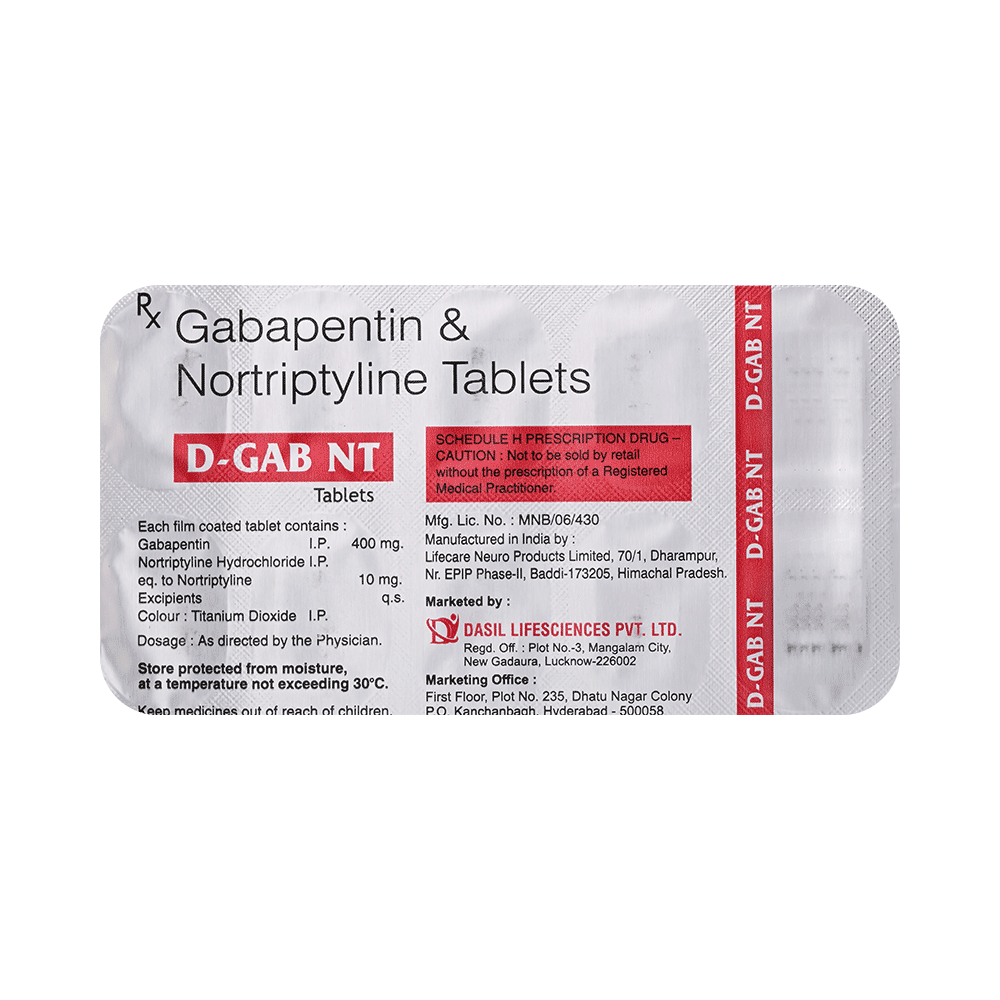D-Gab NT Tablet is a combination of two medicines: Gabapentin and Nortriptyline. Gabapentin is an alpha 2 delta ligand which decreases the pain by modulating calcium channel activity of the nerve cells. Nortriptyline is a tricyclic antidepressant which increases the levels of chemical messengers (serotonin and noradrenaline) that stop the movement of pain signals in the brain. Together, they relieve neuropathic pain (pain from damaged nerves).