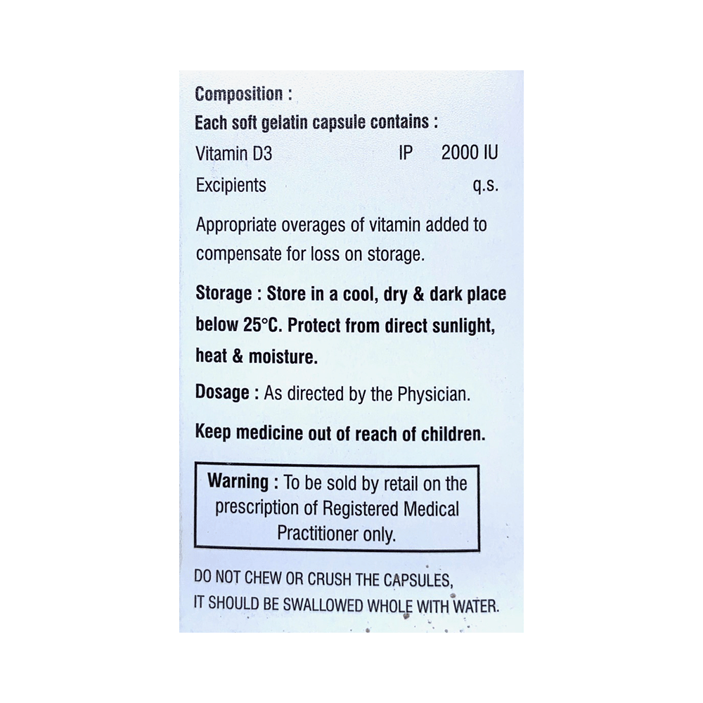 D-Gen 2K Softgel Capsule is used in the treatment of vitamin D deficiency and osteoporosis. It helps the body to absorb calcium. Calcium is essential for maintaining strong and healthy bones. It is used when your diet does not provide enough calcium. D-Gen 2K Softgel Capsule should be taken as directed by your doctor. It is best taken with or after food, as this helps your body absorb it, and you should take it regularly to get the most benefits. If you are using it to treat osteoporosis, you will also be prescribed other medicines. This medicine may be only part of a complete treatment program that includes making changes to your diet and taking calcium and vitamin supplements. Learn about the foods you should eat to ensure you get enough calcium and vitamin D.D-Gen 2K Softgel Capsule has few side effects, and none are common. If you take too much, you may feel weakness, muscle pain, or a metallic taste in your mouth. If you experience any such side effects, speak with your doctor. They may be able to help you reduce or treat the symptoms.Before taking this medicine, tell your doctor if you have high calcium levels in your blood or if you have any heart, kidney, or liver disease. Some other medicines can decrease the absorption of vitamin D3, so let your doctor know about all the other medicines you are taking to make sure you are safe. This medicine may help during pregnancy when your body needs more vitamin D, but too much could harm your baby. Discuss it with your doctor.