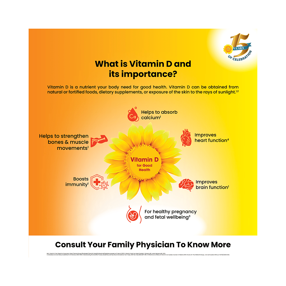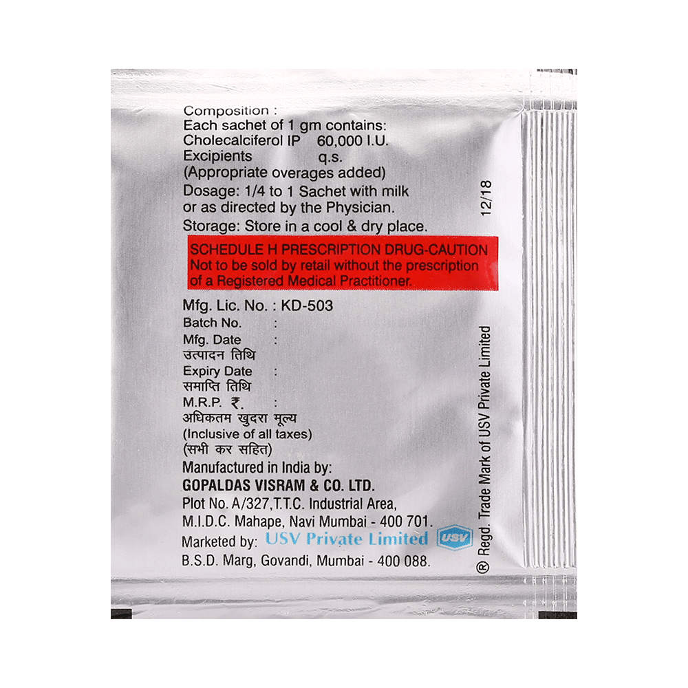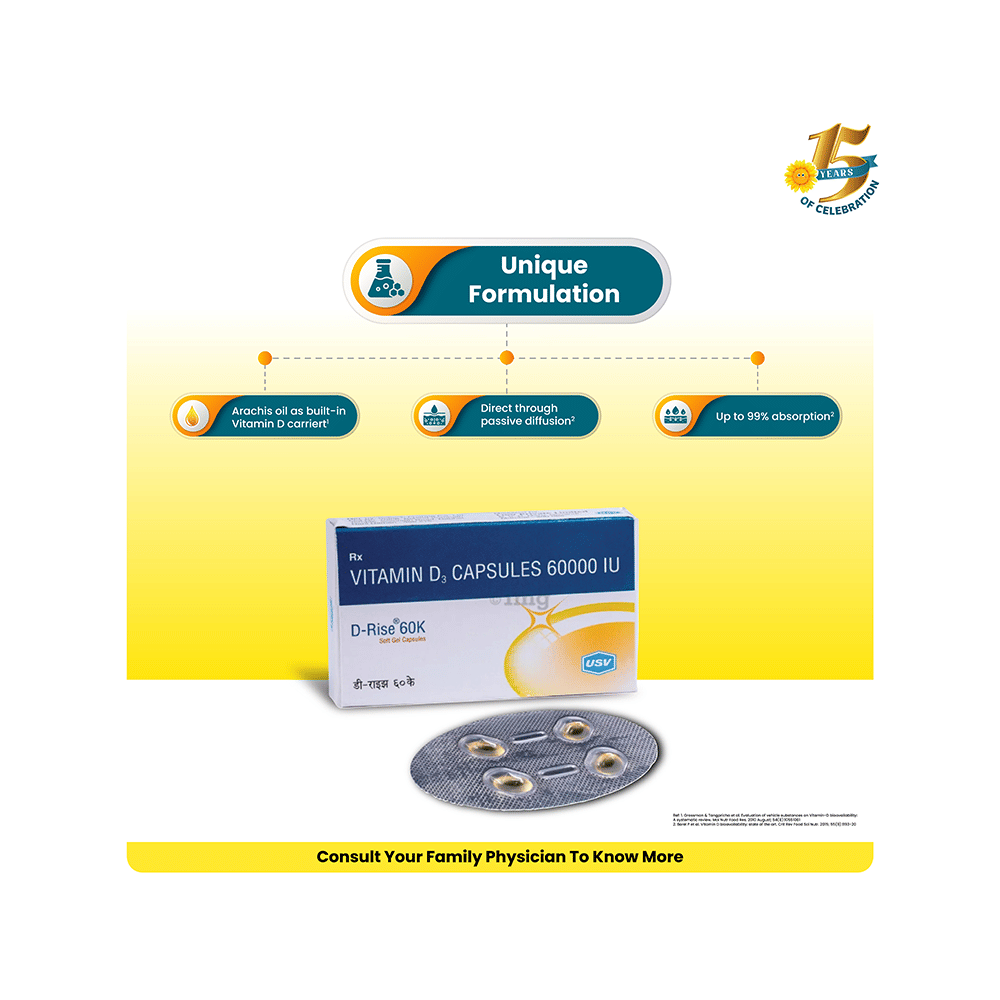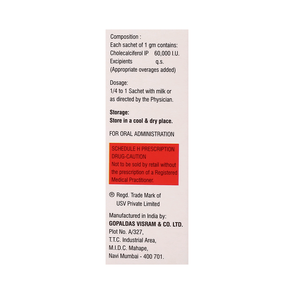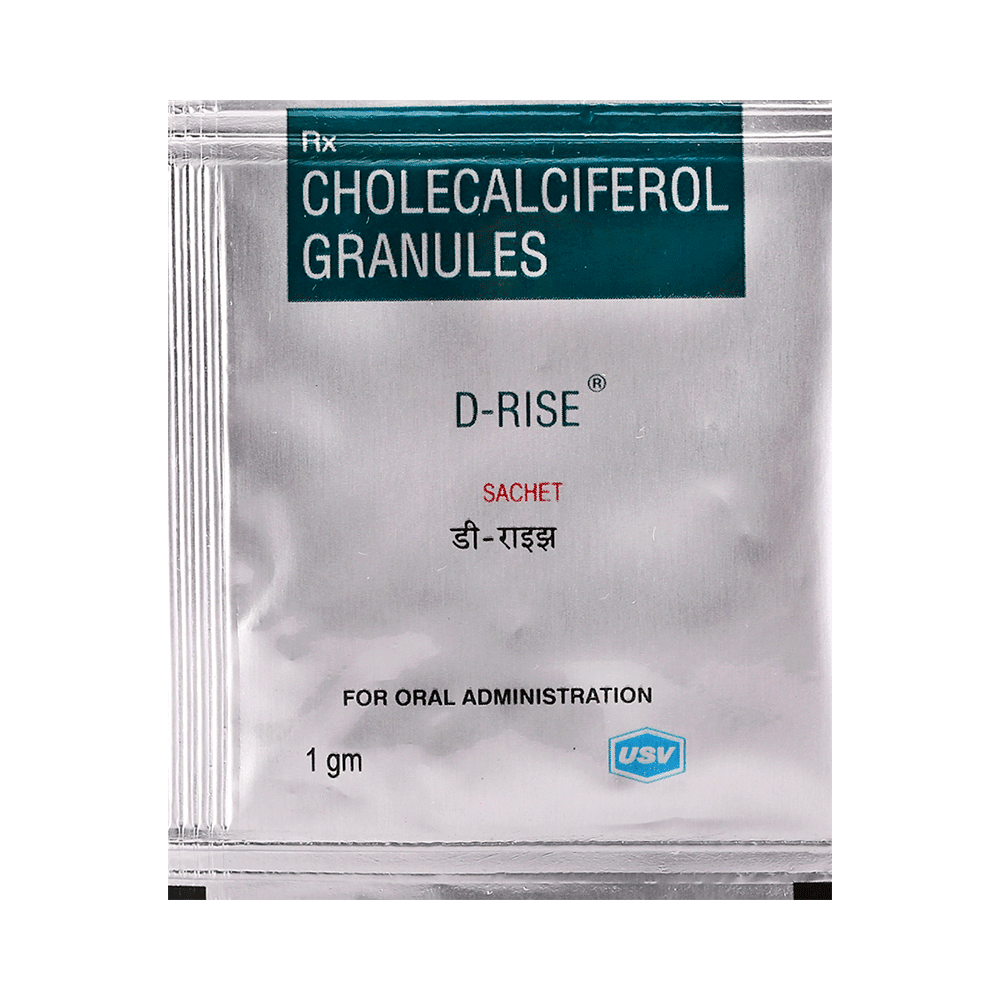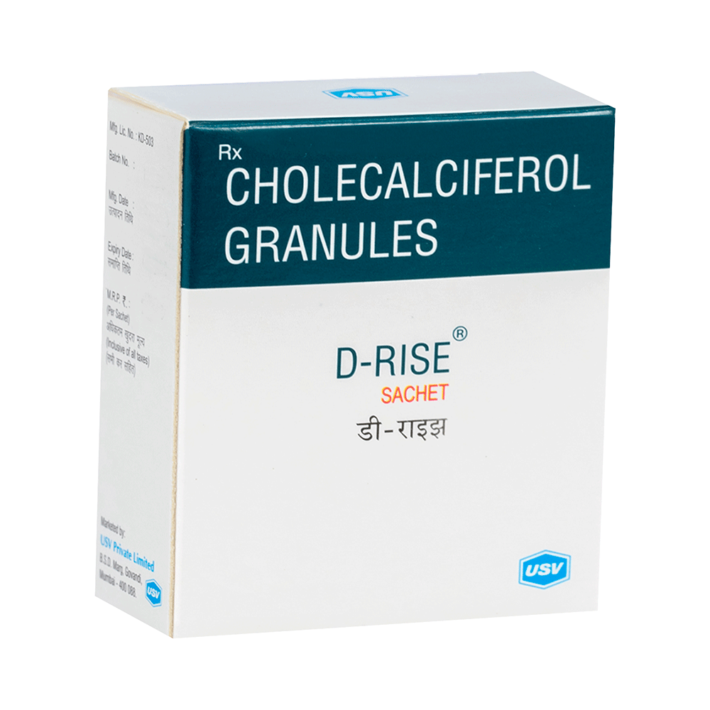 D-Rise Cholecalciferol Sachet for Bone & Joint Health is used in the treatment of vitamin D deficiency and osteoporosis. It helps the body to absorb calcium. Calcium is essential for maintaining strong and healthy bones. It is used when your diet does not provide enough calcium. D-Rise Cholecalciferol Sachet for Bone & Joint Health should be taken as directed by your doctor. It is best taken with or after food, as this helps your body absorb it, and you should take it regularly to get the most benefits. If you are using it to treat osteoporosis, you will also be prescribed other medicines. This medicine may be only part of a complete treatment program that includes making changes to your diet and taking calcium and vitamin supplements. Learn about the foods you should eat to ensure you get enough calcium and vitamin D.D-Rise Cholecalciferol Sachet for Bone & Joint Health has few side effects, and none are common. If you take too much, you may feel weakness, muscle pain, or a metallic taste in your mouth. If you experience any such side effects, speak with your doctor. They may be able to help you reduce or treat the symptoms.Before taking this medicine, tell your doctor if you have high calcium levels in your blood or if you have any heart, kidney, or liver disease. Some other medicines can decrease the absorption of vitamin D3, so let your doctor know about all the other medicines you are taking to make sure you are safe. This medicine may help during pregnancy when your body needs more vitamin D, but too much could harm your baby. Discuss it with your doctor.