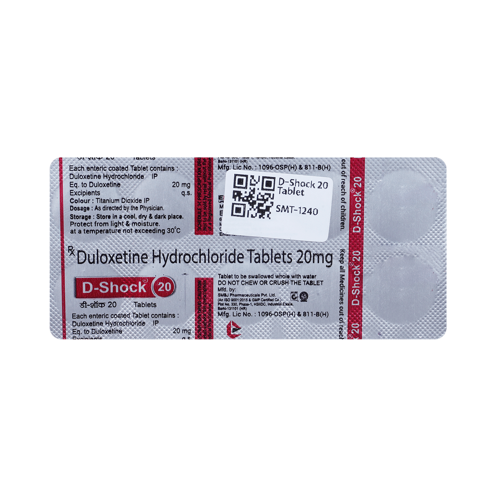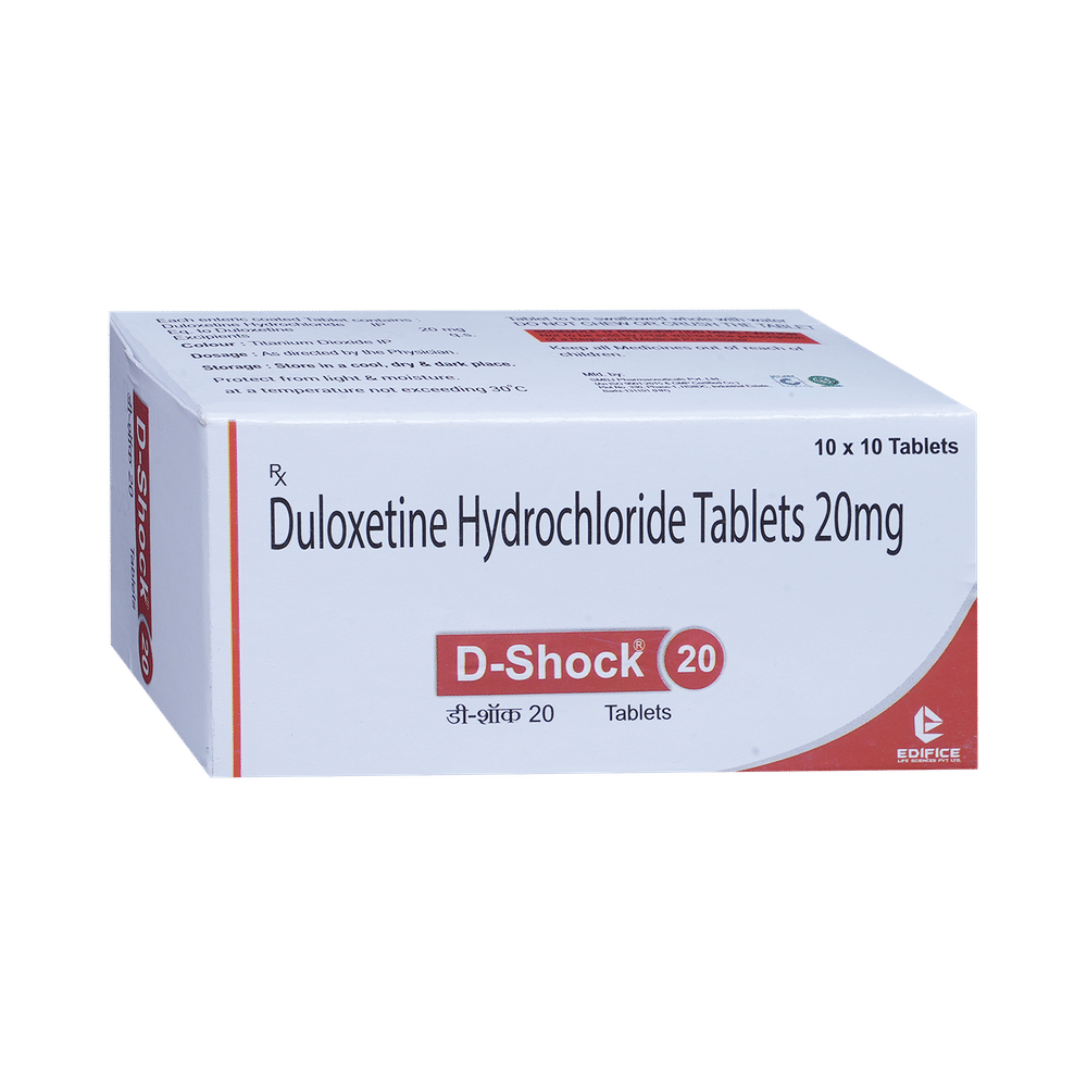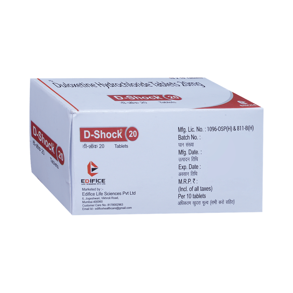D-Shock 20 Tablet is used in the treatment of depression, anxiety disorder, diabetic nerve pain, fibromyalgia (a condition in which there are generalized pain and tenderness in the body), neuropathic pain, and stress urinary incontinence. D-Shock 20 Tablet works by increasing the level of chemical messengers (serotonin and noradrenaline) in the brain that have a calming effect on the brain and relax the nerves, thus treating your illness. It may be taken with or without food. It is advised to take this medicine at a fixed time each day to maintain a consistent level in the blood. If you miss any doses, take it as soon as you remember. Do not skip any doses and finish the full course of treatment even if you feel better. This medication mustn't be stopped suddenly as it may worsen your symptoms.Some common side effects of this medicine include nausea, headache, decreased libido, abnormal dreams, blurred vision, and dry mouth. It even causes dizziness and sleepiness, so do not drive or do anything that requires mental focus until you know how this medicine affects you. However, these side effects are temporary and usually resolve on their own in some time. Please consult your doctor if these do not subside or bother you.Before taking D-Shock 20 Tablet, inform your doctor if you have any problems with your kidneys, heart, liver, or have a history of seizures (epilepsy or fits). Inform your doctor if you develop any unusual changes in mood or behavior, new or worsening depression, or if you have any suicidal thoughts.