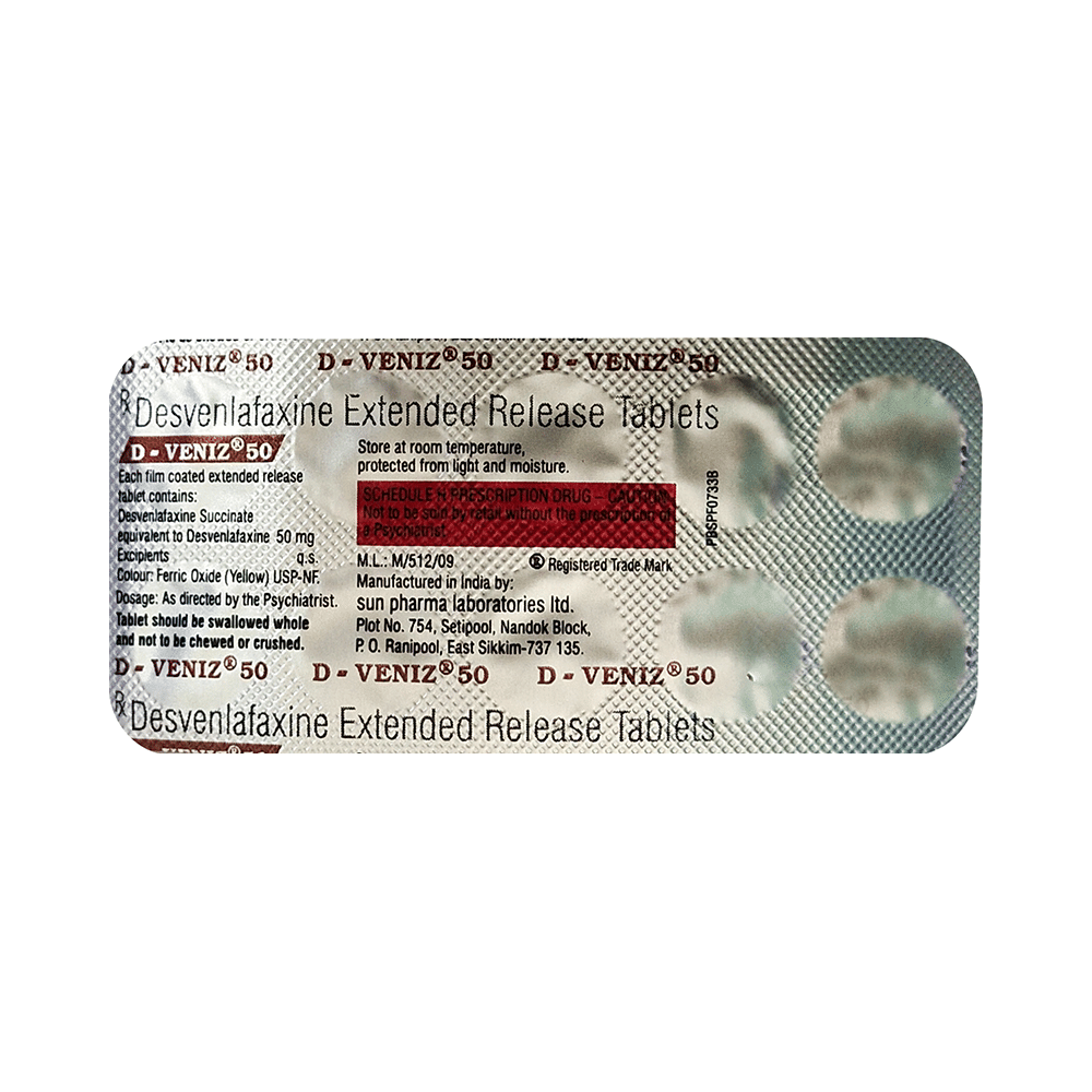 D-Veniz 50 Tablet ER is a prescription medicine used in the treatment of depression. This medicine helps by increasing the level of chemical messengers (serotonin and noradrenaline) in the brain that have a calming effect on the brain and relaxes the nerves, thus treating your depression. D-Veniz 50 Tablet ER is taken by mouth with or without food. Take it at a fixed time each day to maintain consistent level of medicine in the blood. In case you have missed a dose, take it as soon as you remember. Do not skip any doses and finish the full course of treatment even if you feel better. It is important that this medication is not stopped suddenly without talking to doctor as this may worsen your symptoms. Some common side effects of this medicine includes nausea, vomiting, insomnia (difficulty in sleeping), and constipation. It may cause an increase in blood pressure, especially during the first month of treatment, monitor your blood pressure regularly. It may even cause dizziness and sleepiness, do not drive or do anything that requires mental focus until you know how this medicine affects you. It is important to inform your doctor if you develop any unusual changes in mood as it may lead to suicidal thoughts.