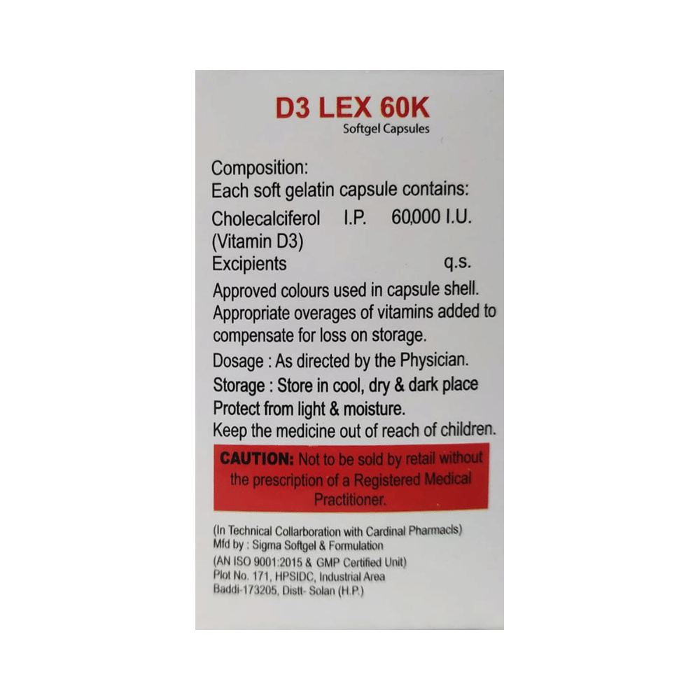 D3 Lex 60K Softgel Capsule is a form of vitamin D. It raises vitamin D levels in your blood. This, in turn, increases calcium levels in your blood by helping you absorb more calcium from food.