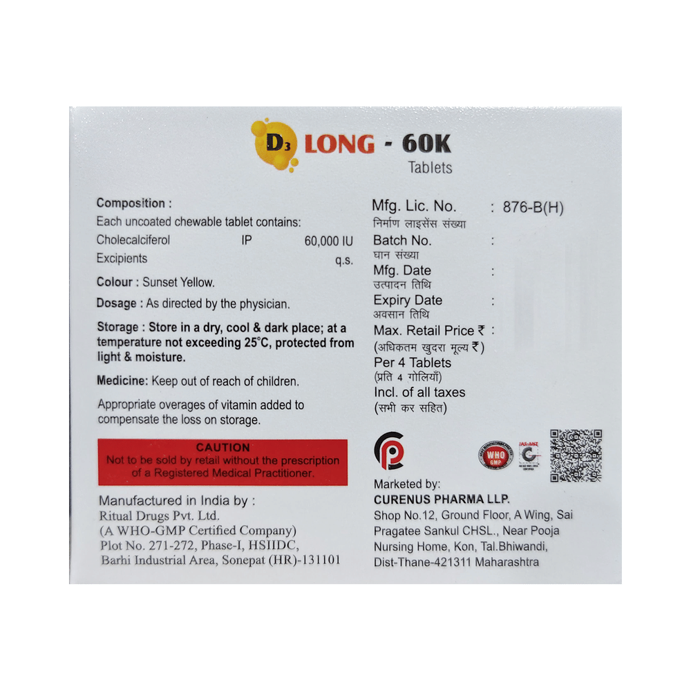 D3-Long 60k Chewable Tablet Orange Sugar Free is used in the treatment of vitamin D deficiency and osteoporosis. It helps the body to absorb calcium. Calcium is essential for maintaining strong and healthy bones. It is used when your diet does not provide enough calcium. D3-Long 60k Chewable Tablet Orange Sugar Free should be taken as directed by your doctor. It is best taken with or after food, as this helps your body absorb it, and you should take it regularly to get the most benefits. If you are using it to treat osteoporosis, you will also be prescribed other medicines. This medicine may be only part of a complete treatment program that includes making changes to your diet and taking calcium and vitamin supplements. Learn about the foods you should eat to ensure you get enough calcium and vitamin D.D3-Long 60k Chewable Tablet Orange Sugar Free has few side effects, and none are common. If you take too much, you may feel weakness, muscle pain, or a metallic taste in your mouth. If you experience any such side effects, speak with your doctor. They may be able to help you reduce or treat the symptoms.Before taking this medicine, tell your doctor if you have high calcium levels in your blood or if you have any heart, kidney, or liver disease. Some other medicines can decrease the absorption of vitamin D3, so let your doctor know about all the other medicines you are taking to make sure you are safe. This medicine may help during pregnancy when your body needs more vitamin D, but too much could harm your baby. Discuss it with your doctor.