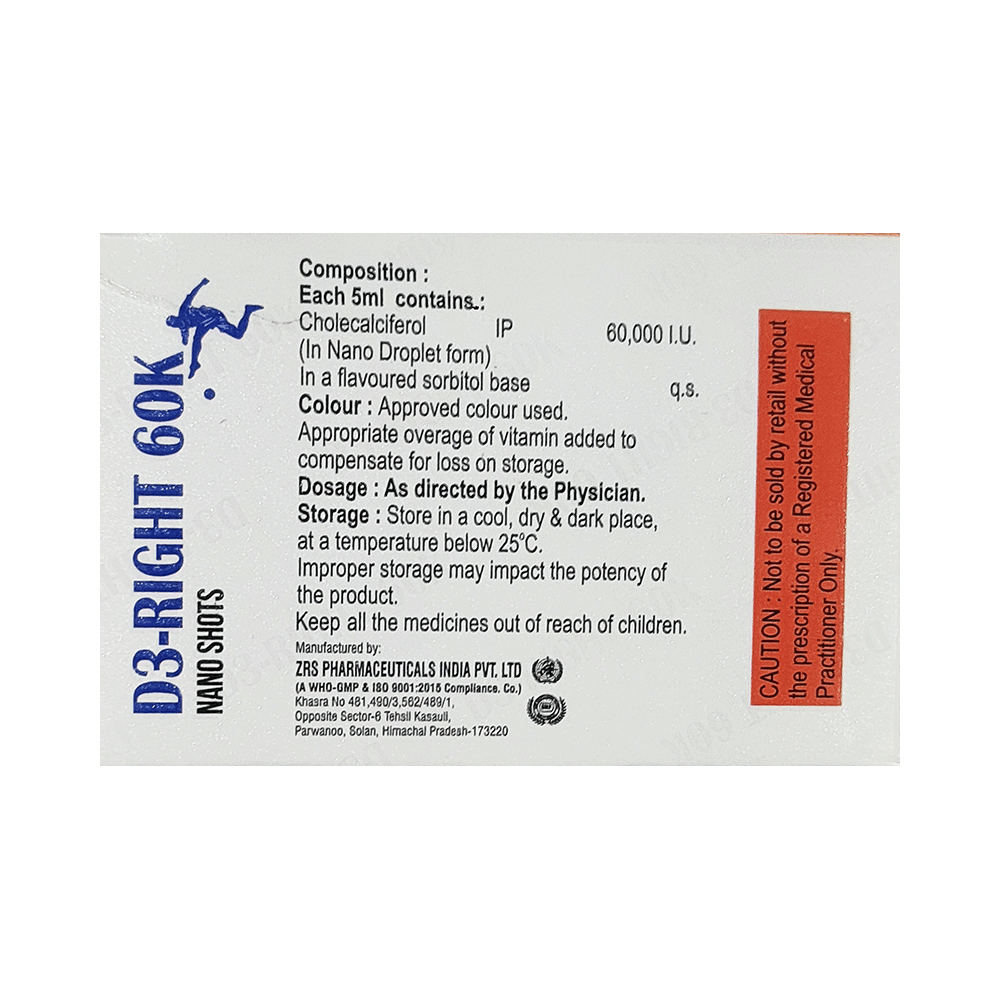 D3 Right 60K Nano Shot (5ml Each) Mango is used in the treatment of vitamin D deficiency and osteoporosis. It helps the body to absorb calcium. Calcium is essential for maintaining strong and healthy bones. It is used when your diet does not provide enough calcium. D3 Right 60K Nano Shot (5ml Each) Mango should be taken as directed by your doctor. It is best taken with or after food, as this helps your body absorb it, and you should take it regularly to get the most benefits. If you are using it to treat osteoporosis, you will also be prescribed other medicines. This medicine may be only part of a complete treatment program that includes making changes to your diet and taking calcium and vitamin supplements. Learn about the foods you should eat to ensure you get enough calcium and vitamin D.D3 Right 60K Nano Shot (5ml Each) Mango has few side effects, and none are common. If you take too much, you may feel weakness, muscle pain, or a metallic taste in your mouth. If you experience any such side effects, speak with your doctor. They may be able to help you reduce or treat the symptoms.Before taking this medicine, tell your doctor if you have high calcium levels in your blood or if you have any heart, kidney, or liver disease. Some other medicines can decrease the absorption of vitamin D3, so let your doctor know about all the other medicines you are taking to make sure you are safe. This medicine may help during pregnancy when your body needs more vitamin D, but too much could harm your baby. Discuss it with your doctor.