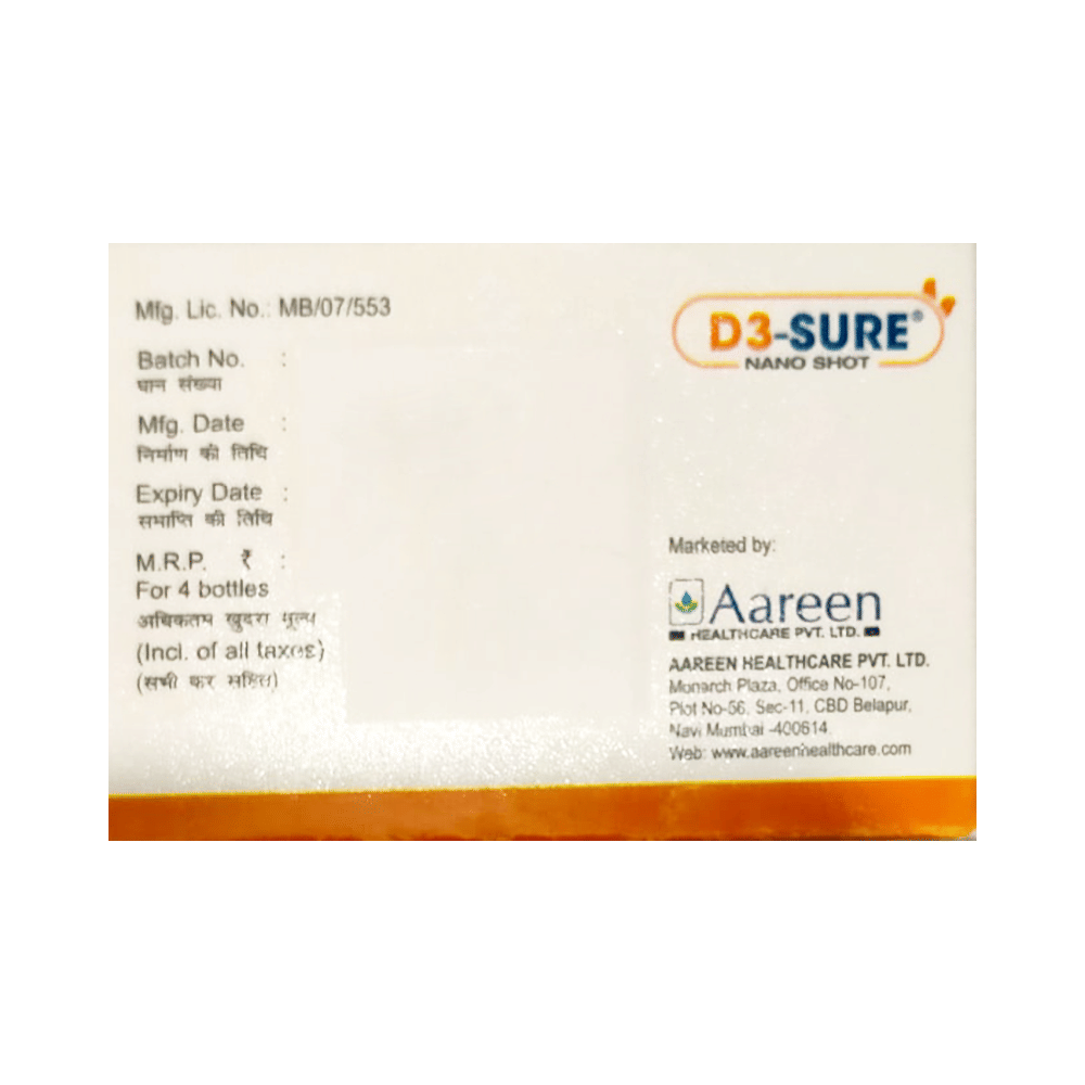 D3 Sure Nano Shot Oral Solution 5ml is used in the treatment of vitamin D deficiency and osteoporosis. It helps the body to absorb calcium. Calcium is essential for maintaining strong and healthy bones. It is used when your diet does not provide enough calcium. D3 Sure Nano Shot Oral Solution 5ml should be taken as directed by your doctor. It is best taken with or after food, as this helps your body absorb it, and you should take it regularly to get the most benefits. If you are using it to treat osteoporosis, you will also be prescribed other medicines. This medicine may be only part of a complete treatment program that includes making changes to your diet and taking calcium and vitamin supplements. Learn about the foods you should eat to ensure you get enough calcium and vitamin D.D3 Sure Nano Shot Oral Solution 5ml has few side effects, and none are common. If you take too much, you may feel weakness, muscle pain, or a metallic taste in your mouth. If you experience any such side effects, speak with your doctor. They may be able to help you reduce or treat the symptoms.Before taking this medicine, tell your doctor if you have high calcium levels in your blood or if you have any heart, kidney, or liver disease. Some other medicines can decrease the absorption of vitamin D3, so let your doctor know about all the other medicines you are taking to make sure you are safe. This medicine may help during pregnancy when your body needs more vitamin D, but too much could harm your baby. Discuss it with your doctor.