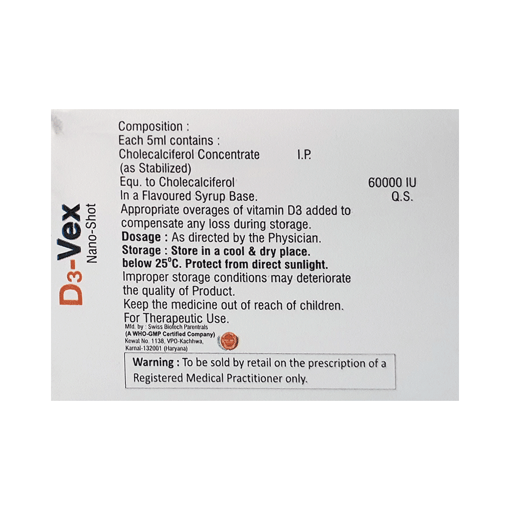 D3-Vex Nano-Shot Delicious Orange Sugar Free is used in the treatment of vitamin D deficiency and osteoporosis. It helps the body to absorb calcium. Calcium is essential for maintaining strong and healthy bones. It is used when your diet does not provide enough calcium. D3-Vex Nano-Shot Delicious Orange Sugar Free should be taken as directed by your doctor. It is best taken with or after food, as this helps your body absorb it, and you should take it regularly to get the most benefits. If you are using it to treat osteoporosis, you will also be prescribed other medicines. This medicine may be only part of a complete treatment program that includes making changes to your diet and taking calcium and vitamin supplements. Learn about the foods you should eat to ensure you get enough calcium and vitamin D.D3-Vex Nano-Shot Delicious Orange Sugar Free has few side effects, and none are common. If you take too much, you may feel weakness, muscle pain, or a metallic taste in your mouth. If you experience any such side effects, speak with your doctor. They may be able to help you reduce or treat the symptoms.Before taking this medicine, tell your doctor if you have high calcium levels in your blood or if you have any heart, kidney, or liver disease. Some other medicines can decrease the absorption of vitamin D3, so let your doctor know about all the other medicines you are taking to make sure you are safe. This medicine may help during pregnancy when your body needs more vitamin D, but too much could harm your baby. Discuss it with your doctor.