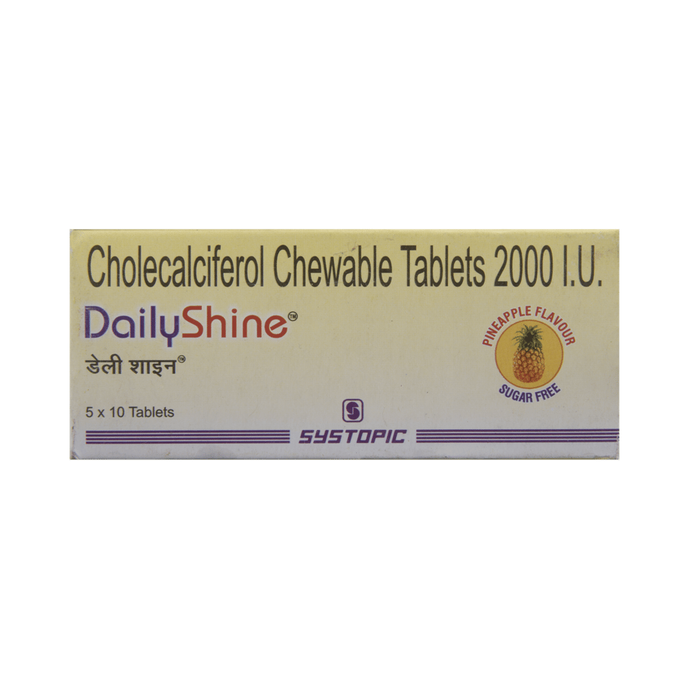 Dailyshine 2000IU Tablet is used in the treatment of vitamin D deficiency and osteoporosis. It helps the body to absorb calcium. Calcium is essential for maintaining strong and healthy bones. It is used when your diet does not provide enough calcium. Dailyshine 2000IU Tablet should be taken as directed by your doctor. It is best taken with or after food, as this helps your body absorb it, and you should take it regularly to get the most benefits. If you are using it to treat osteoporosis, you will also be prescribed other medicines. This medicine may be only part of a complete treatment program that includes making changes to your diet and taking calcium and vitamin supplements. Learn about the foods you should eat to ensure you get enough calcium and vitamin D.Dailyshine 2000IU Tablet has few side effects, and none are common. If you take too much, you may feel weakness, muscle pain, or a metallic taste in your mouth. If you experience any such side effects, speak with your doctor. They may be able to help you reduce or treat the symptoms.Before taking this medicine, tell your doctor if you have high calcium levels in your blood or if you have any heart, kidney, or liver disease. Some other medicines can decrease the absorption of vitamin D3, so let your doctor know about all the other medicines you are taking to make sure you are safe. This medicine may help during pregnancy when your body needs more vitamin D, but too much could harm your baby. Discuss it with your doctor.
