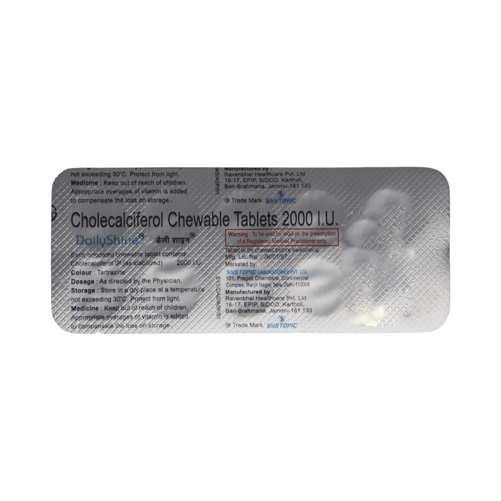 Dailyshine 2000IU Tablet is a form of vitamin D. It raises vitamin D levels in your blood. This, in turn, increases calcium levels in your blood by helping you absorb more calcium from food.