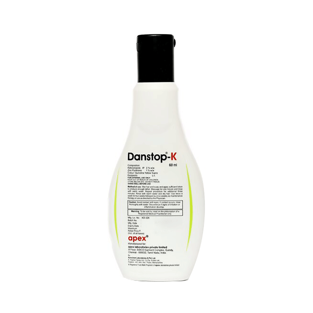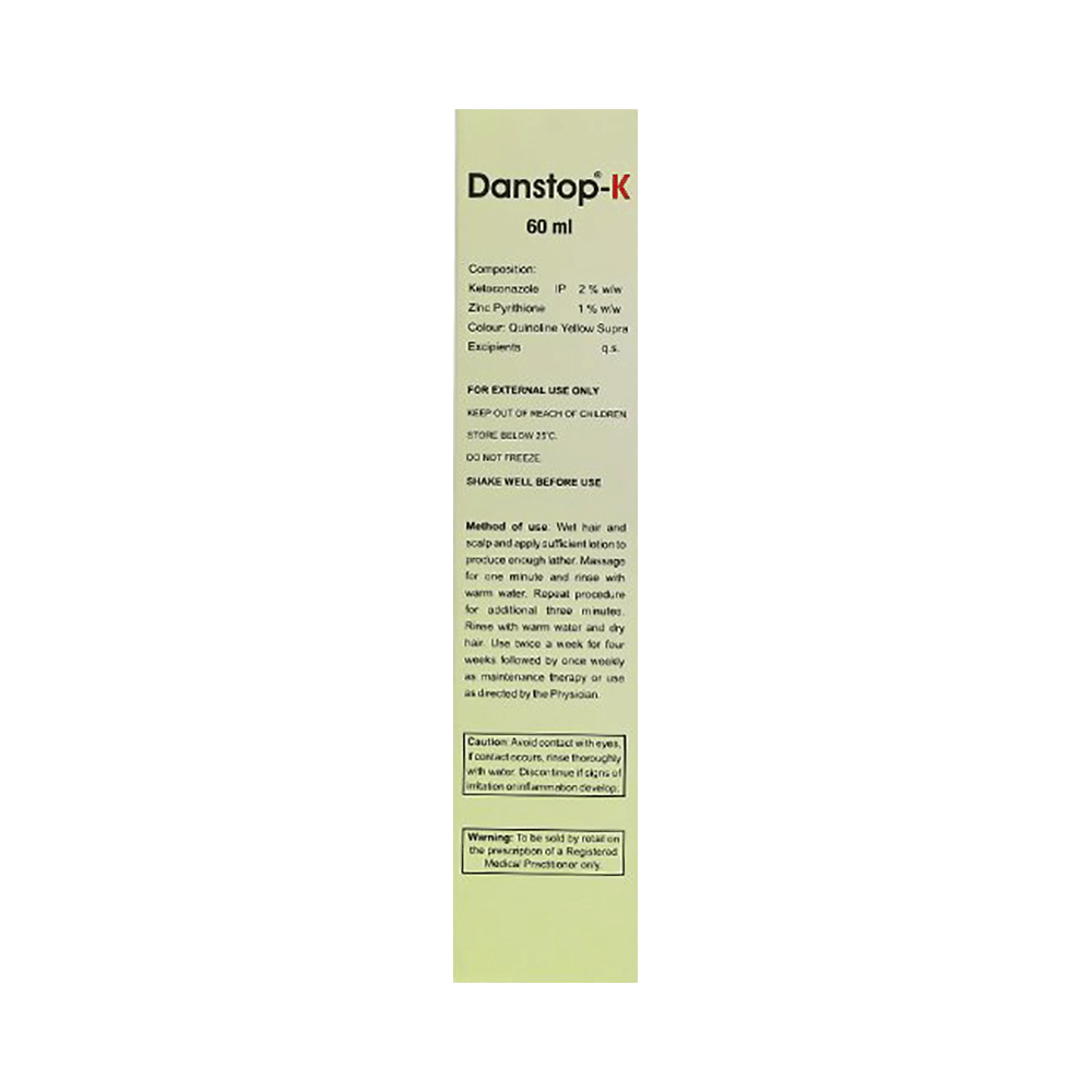 Danstop-K Lotion is a combination of two antifungal medicines that effectively treat fungal skin infections and dandruff. It kills the fungi that cause the infection and relieves itching and irritation. Danstop-K Lotion is only meant for external use and should be used as your doctor advises. A thin layer of the medicine should be applied only to the affected areas of the skin with clean and dry hands. Wash your hands before and after the application of the medicine. If it gets into your eyes, nose, or mouth, rinse with water. It may take several days to weeks for your symptoms to improve, but you should keep using this medicine regularly. The course of the treatment should be completed to ensure better efficacy of the medicine.Common side effects of Danstop-K Lotion include a burning sensation, redness, and itching of the skin. Consult your doctor if they persist or become bothersome. These symptoms are usually temporary and resolve on their own. If the irritation persists or worsens, stop using it and consult a doctor.Before using Danstop-K Lotion, check for allergies to its ingredients and avoid it if you have sensitive skin or open wounds. Pregnant or breastfeeding women should consult a doctor before use to make sure it is safe for them. Discontinue if irritation occurs and seek medical advice if symptoms persist. Talk to your doctor before using it if you have recently used another medicine for dandruff.