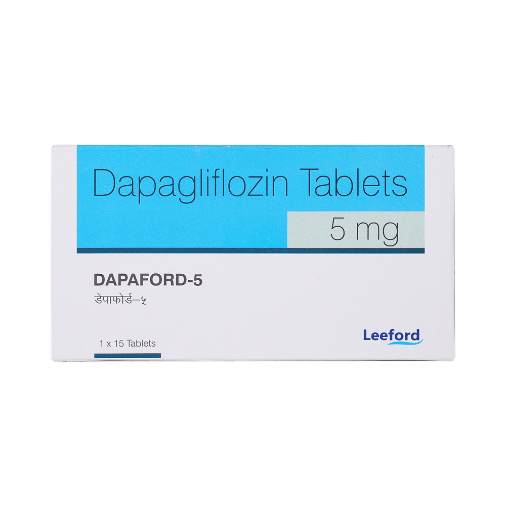 Dapaford 5 Tablet is used alone or in combination with other medicines to treat type 2 diabetes mellitus. It helps control the high blood sugar levels seen in diabetes. This reduces the chances of serious complications of diabetes and also helps prevent heart disease. Dapaford 5 Tablet can be taken with or without food at any time of day, but you should try to take it at the same time every day. The dose will be decided by your doctor. Do not stop taking it without asking your doctor. If you do, your blood sugar levels may increase and put you at risk of serious complications like kidney damage and blindness. This medicine is only part of a treatment program that should include a healthy diet, regular exercise, and weight reduction as advised by your doctor.The most common side effects of Dapaford 5 Tablet include nausea, fungal infection of the vagina, nasopharyngitis (inflammation of the throat and nasal passages), and urinary tract infections. It may cause the body to lose too much water. Drink plenty of fluids to prevent dehydration. Maintaining good hygiene can help prevent the development of fungal infections in the genital area.Before taking this medicine, inform your doctor if you have any kidney or liver problems or a urinary tract infection, or if you are on water pills (diuretics). Pregnant or breastfeeding women should also consult their doctor before taking it. Avoid excessive alcohol intake while taking it, as this may increase the risk of developing some side effects. Monitor your blood sugar levels regularly while taking this medicine.