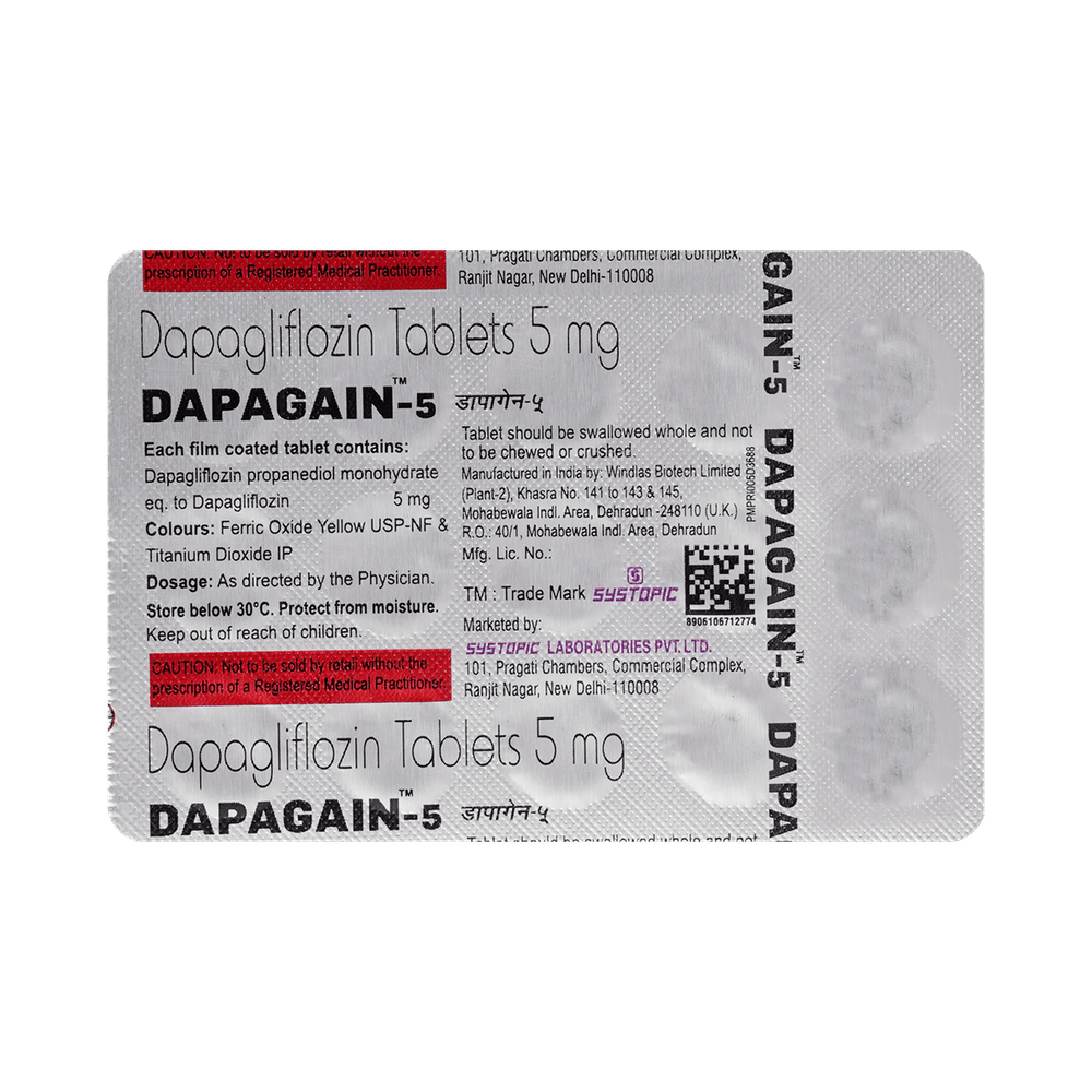 Dapagain 5mg Tablet is used alone or in combination with other medicines to treat type 2 diabetes mellitus. It helps control the high blood sugar levels seen in diabetes. This reduces the chances of serious complications of diabetes and also helps prevent heart disease. Dapagain 5mg Tablet can be taken with or without food at any time of day, but you should try to take it at the same time every day. The dose will be decided by your doctor. Do not stop taking it without asking your doctor. If you do, your blood sugar levels may increase and put you at risk of serious complications like kidney damage and blindness. This medicine is only part of a treatment program that should include a healthy diet, regular exercise, and weight reduction as advised by your doctor.The most common side effects of Dapagain 5mg Tablet include nausea, fungal infection of the vagina, nasopharyngitis (inflammation of the throat and nasal passages), and urinary tract infections. It may cause the body to lose too much water. Drink plenty of fluids to prevent dehydration. Maintaining good hygiene can help prevent the development of fungal infections in the genital area.Before taking this medicine, inform your doctor if you have any kidney or liver problems or a urinary tract infection, or if you are on water pills (diuretics). Pregnant or breastfeeding women should also consult their doctor before taking it. Avoid excessive alcohol intake while taking it, as this may increase the risk of developing some side effects. Monitor your blood sugar levels regularly while taking this medicine.