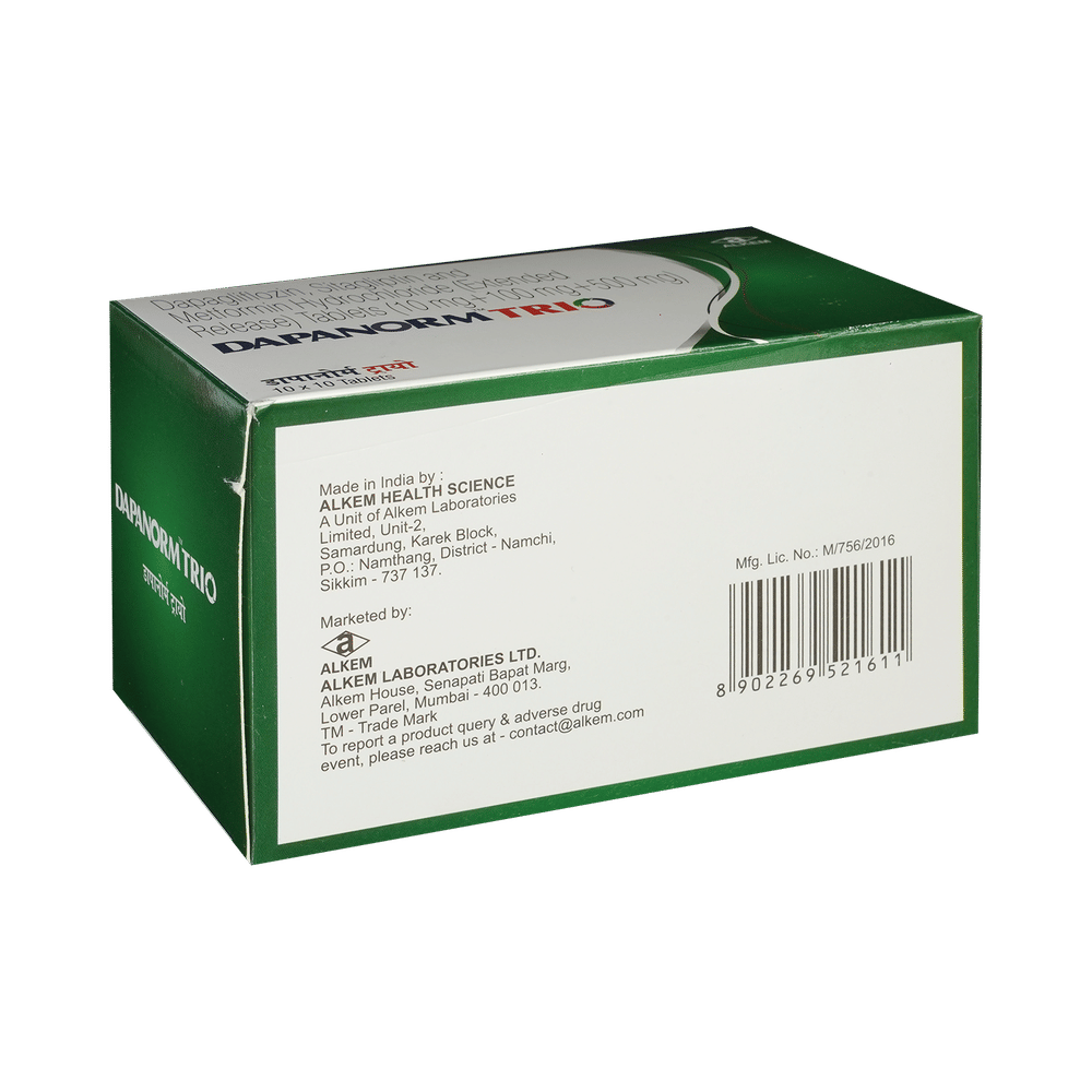 Dapanorm Trio Tablet ER is a combination medicine that helps control blood sugar levels. This medicine is used with diet and exercise to improve blood sugar control in adults with type 2 diabetes mellitus. It helps in the proper utilization of insulin, thereby lowering the blood sugar level. Dapanorm Trio Tablet ER can be taken with or without food at any time of the day, but try to take it at the same time every day. The dose will be decided by your doctor, so do not stop taking it without asking them. If you do, your blood sugar levels may increase your risk of serious complications like kidney damage and blindness. This medicine is only a part of the treatment program that should include a healthy diet, regular exercise, and weight reduction as advised by your doctor.The most common side effects of this medicine include urinary tract infection, nasal congestion, sore throat, and upper respiratory tract infection. Drinking plenty of fluids while using it will help prevent dehydration. Some people may develop fungal infections in the genital area. Maintaining good hygiene can help prevent this.Before taking Dapanorm Trio Tablet ER, inform your doctor if you have any kidney or liver problems, a urinary tract infection, or if you are on water pills (diuretics). Pregnant or breastfeeding women should also consult their doctor before taking it. Avoid excessive alcohol intake while taking this medicine, as this may increase the risk of some side effects. Monitor your blood sugar levels regularly while taking this medicine.