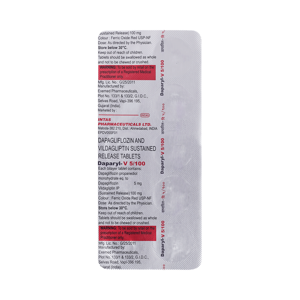 dapaRYL V 5mg/100mg Tablet is a combination medicine that helps control blood sugar levels. This medicine is used together with diet and exercise to improve blood sugar control in adults with type 2 diabetes mellitus. It helps in proper utilization of insulin, thereby lowering the blood sugar level. dapaRYL V 5mg/100mg Tablet can be taken with or without food at any time of day but you should try to take it at the same time every day. The dose will be decided by your doctor. Don’t stop taking it without asking your doctor. If you do, your blood sugar levels may increase and put you at risk of serious complications like kidney damage and blindness. This medicine is only part of a treatment program that should include a healthy diet, regular exercise, and weight reduction as advised by your doctor.Common side effects of this medicine include hypoglycemia, vaginal inflammation, urinary tract infections, dizziness, tremor, and headache. Drinking plenty of fluids while using it will help prevent dehydration. Some people may develop fungal infections in the genital area. Maintaining good hygiene can help prevent this.Before taking this medicine, inform your doctor if you have any kidney or liver problems or a urinary tract infection or if you are on water pills (diuretics). Pregnant or breastfeeding women should also consult their doctor before taking it. Avoid excessive alcohol intake while taking it as this may increase the risk of developing some side effects. Monitor your blood sugar levels regularly while taking this medicine.