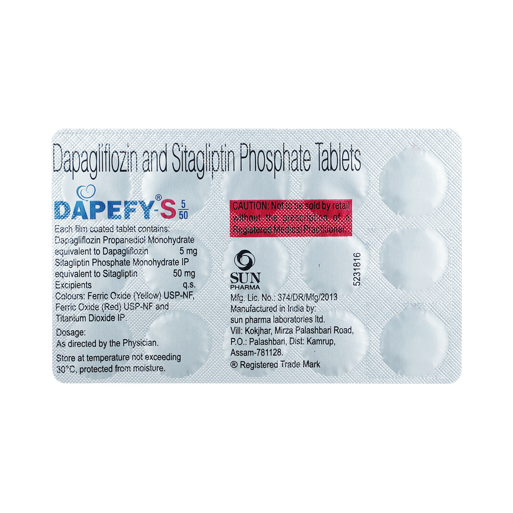 Dapefy-S 5/50 Tablet is a combination medicine that helps control blood sugar levels. This medicine is used together with diet and exercise to improve blood sugar control in adults with type 2 diabetes mellitus. It helps in proper utilization of insulin, thereby lowering the blood sugar level. Dapefy-S 5/50 Tablet can be taken with or without food at any time of day but try to take it at the same time every day. The dose will be decided by your doctor, and don’t stop taking it without consulting them. If you do, your blood sugar levels may increase and put you at risk of serious complications like kidney damage and blindness. This medicine is only a part of the treatment program that should include a healthy diet, regular exercise, and weight reduction as advised by your doctor.The most common side effects of Dapefy-S 5/50 Tablet include urinary tract infection, nasal congestion, sore throat, and upper respiratory tract infection. Drinking plenty of fluids while using it will help prevent dehydration. Some people may develop fungal infections in the genital area. Maintaining good hygiene can help prevent this.Before taking this medicine, inform your doctor if you have any kidney or liver problems, a urinary tract infection, or you are on water pills (diuretics). Pregnant or breastfeeding women should also consult their doctor before taking it. Avoid excessive alcohol intake while taking this drug as this may increase the risk of some side effects. Monitor your blood sugar levels regularly while taking this medicine.