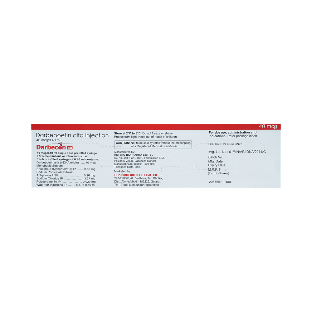 Darbecon 40 Injection is used in the treatment of anemia that may have occurred due to chronic kidney disease or chemotherapy. It works by stimulating the bone marrow to produce more red blood cells. Darbecon 40 Injection is a medicine that needs to be used with utmost care because it can lead to serious side effects. It is important that you seek treatment from a doctor who is experienced in providing this medical therapy. You should follow all the directions of the doctor strictly. It is given under the supervision of a healthcare professional.Common side effects include abdominal pain, high blood pressure, rash, injection site pain, breathlessness, cough, and peripheral edema. Inform your doctor if there are symptoms of very high blood pressure, such as severe headache, problems with your eyesight, nausea, vomiting, or fits (seizures).Your doctor may get your blood tests done regularly to monitor the levels of salts (electrolytes such as potassium), hemoglobin, and blood cells in your blood. You should stop taking it and consult with a doctor if you develop shortness of breath or a skin rash.Before taking Darbecon 40 Injection, tell your doctor if you have heart disease, high blood pressure, or have had a seizure or stroke. If you are pregnant or breastfeeding, or plan to become pregnant, consult your doctor to make sure it is safe for you.