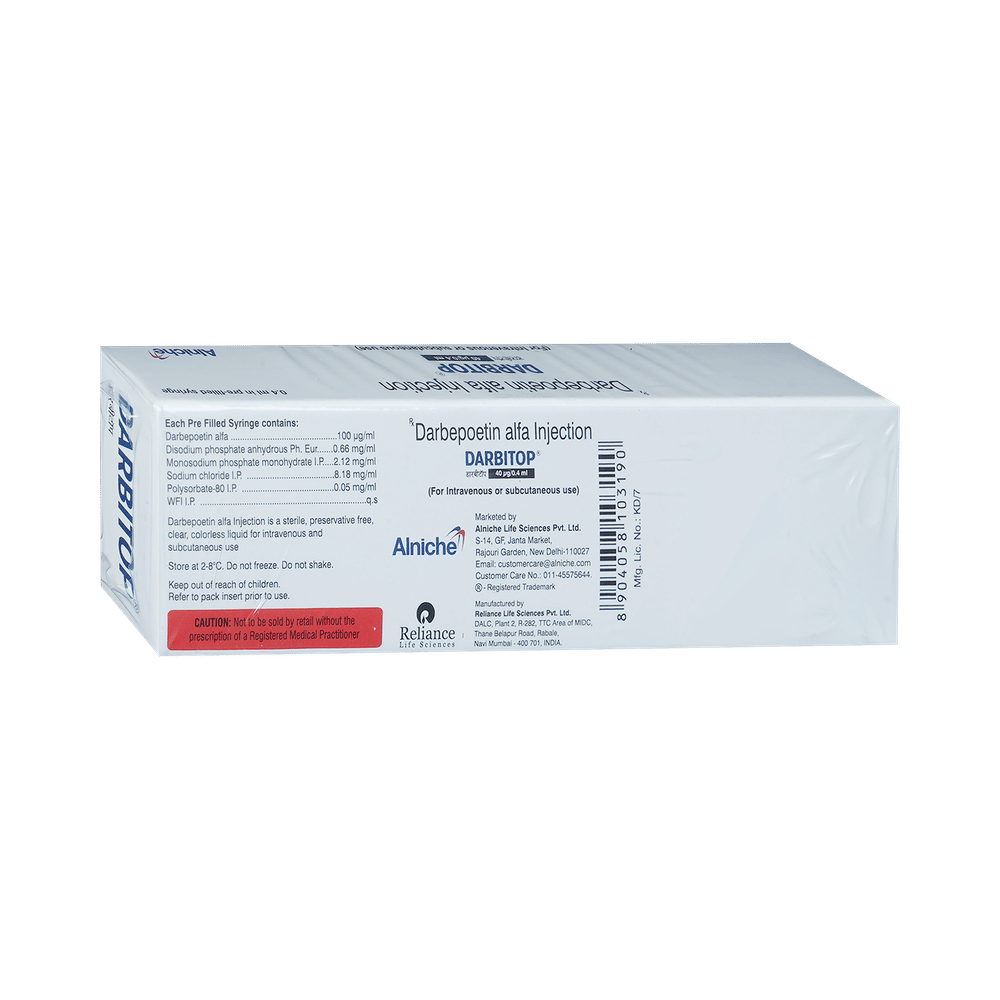 Darbitop 40mcg Injection is used in the treatment of anemia that may have occurred due to chronic kidney disease or chemotherapy. It works by stimulating the bone marrow to produce more red blood cells. Darbitop 40mcg Injection is a medicine that needs to be used with utmost care because it can lead to serious side effects. It is important that you seek treatment from a doctor who is experienced in providing this medical therapy. You should follow all the directions of the doctor strictly. It is given under the supervision of a healthcare professional.Common side effects include abdominal pain, high blood pressure, rash, injection site pain, breathlessness, cough, and peripheral edema. Inform your doctor if there are symptoms of very high blood pressure, such as severe headache, problems with your eyesight, nausea, vomiting, or fits (seizures).Your doctor may get your blood tests done regularly to monitor the levels of salts (electrolytes such as potassium), hemoglobin, and blood cells in your blood. You should stop taking it and consult with a doctor if you develop shortness of breath or a skin rash.Before taking Darbitop 40mcg Injection, tell your doctor if you have heart disease, high blood pressure, or have had a seizure or stroke. If you are pregnant or breastfeeding, or plan to become pregnant, consult your doctor to make sure it is safe for you.