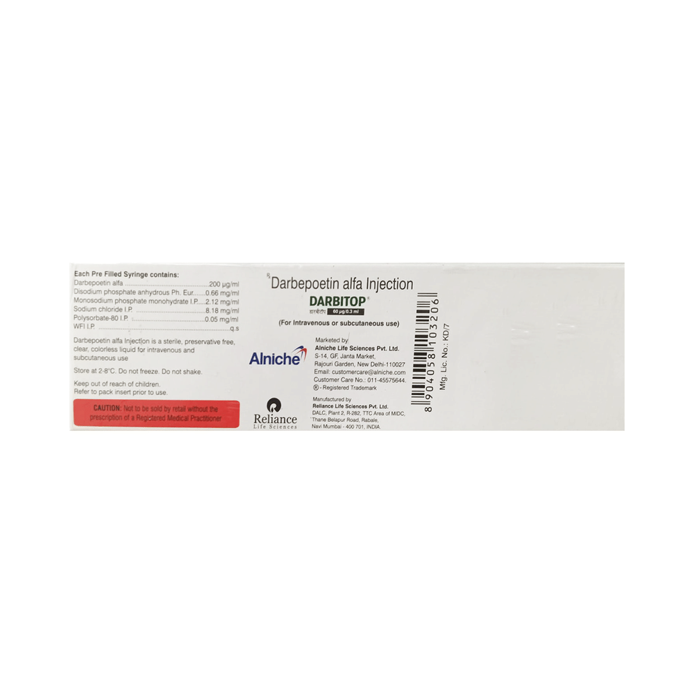 Darbitop Injection is used in the treatment of anemia that may have occurred due to chronic kidney disease or chemotherapy. It works by stimulating the bone marrow to produce more red blood cells. Darbitop Injection is a medicine that needs to be used with utmost care because it can lead to serious side effects. It is important that you seek treatment from a doctor who is experienced in providing this medical therapy. You should follow all the directions of the doctor strictly. It is given under the supervision of a healthcare professional.Common side effects include abdominal pain, high blood pressure, rash, injection site pain, breathlessness, cough, and peripheral edema. Inform your doctor if there are symptoms of very high blood pressure, such as severe headache, problems with your eyesight, nausea, vomiting, or fits (seizures).Your doctor may get your blood tests done regularly to monitor the levels of salts (electrolytes such as potassium), hemoglobin, and blood cells in your blood. You should stop taking it and consult with a doctor if you develop shortness of breath or a skin rash.Before taking Darbitop Injection, tell your doctor if you have heart disease, high blood pressure, or have had a seizure or stroke. If you are pregnant or breastfeeding, or plan to become pregnant, consult your doctor to make sure it is safe for you.