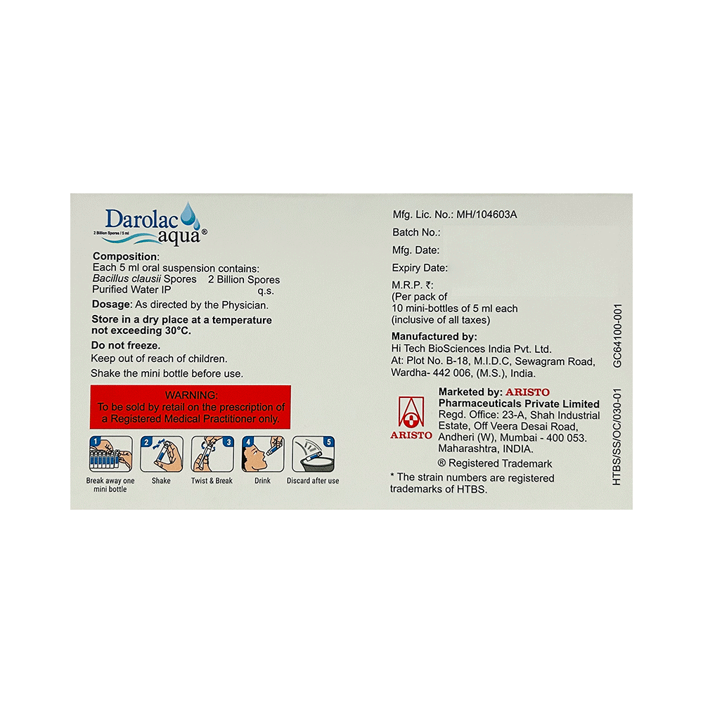 Darolac Aqua (5ml Each) Oral Suspension is a probiotic. It works by restoring the balance of good bacteria in the intestine that may get upset after antibiotic use or due to intestinal infections.