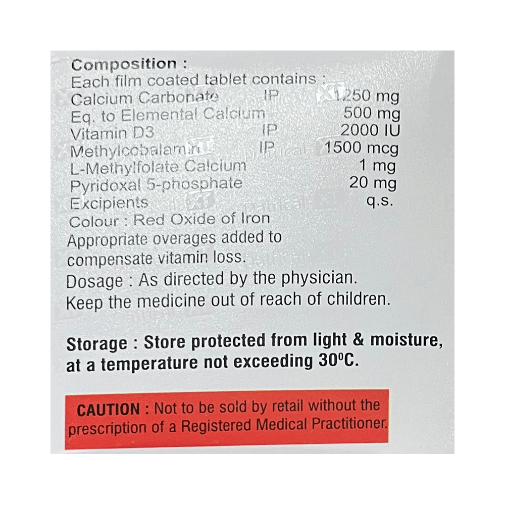 Salt Composition: Calcium Carbonate (500mg) + Vitamin D3 (2000IU) + Methylcobalamin (1500mcg) + L-Methyl Folate Calcium (1mg) + Pyridoxal-5-phosphate (20mg)