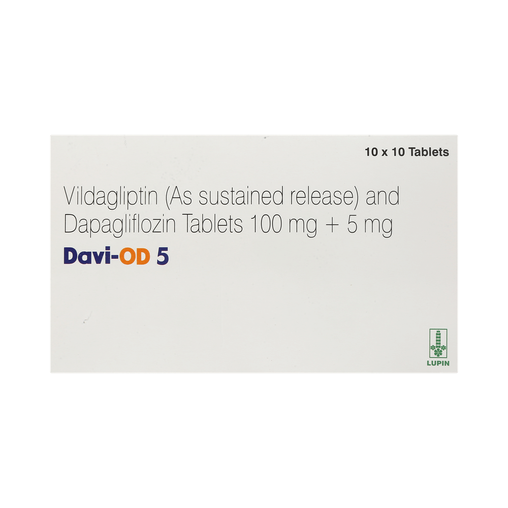 Davi OD 5mg/100mg Tablet is a combination medicine that helps control blood sugar levels. This medicine is used together with diet and exercise to improve blood sugar control in adults with type 2 diabetes mellitus. It helps in proper utilization of insulin, thereby lowering the blood sugar level. Davi OD 5mg/100mg Tablet can be taken with or without food at any time of day but you should try to take it at the same time every day. The dose will be decided by your doctor. Don’t stop taking it without asking your doctor. If you do, your blood sugar levels may increase and put you at risk of serious complications like kidney damage and blindness. This medicine is only part of a treatment program that should include a healthy diet, regular exercise, and weight reduction as advised by your doctor.Common side effects of this medicine include hypoglycemia, vaginal inflammation, urinary tract infections, dizziness, tremor, and headache. Drinking plenty of fluids while using it will help prevent dehydration. Some people may develop fungal infections in the genital area. Maintaining good hygiene can help prevent this.Before taking this medicine, inform your doctor if you have any kidney or liver problems or a urinary tract infection or if you are on water pills (diuretics). Pregnant or breastfeeding women should also consult their doctor before taking it. Avoid excessive alcohol intake while taking it as this may increase the risk of developing some side effects. Monitor your blood sugar levels regularly while taking this medicine.