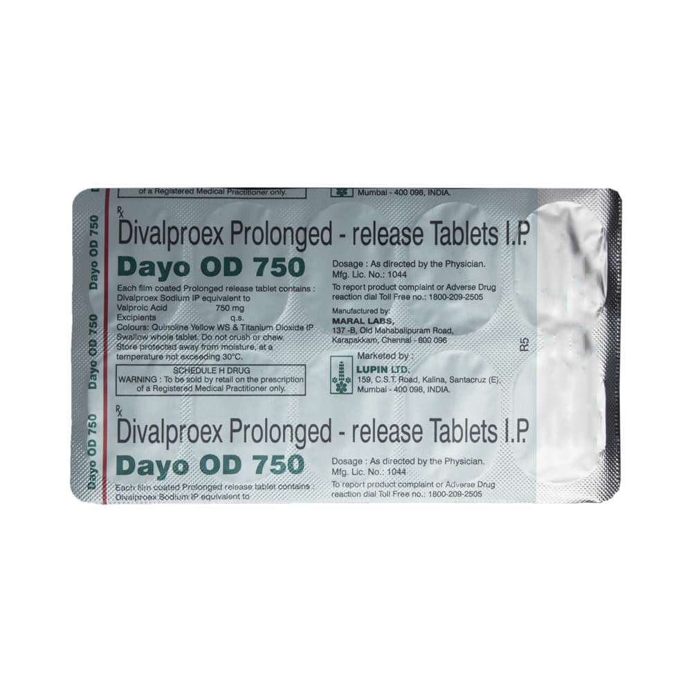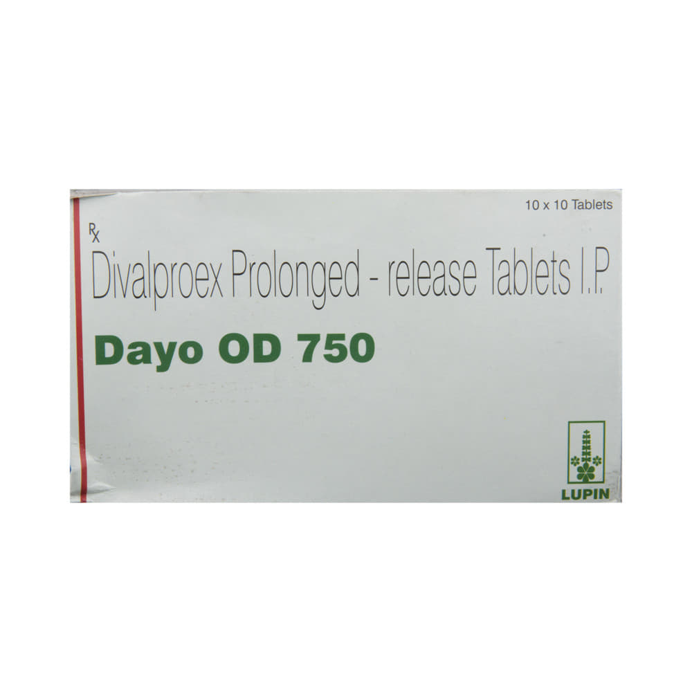 Dayo OD 750 Tablet PR is a medication used to treat epilepsy, seizures, bipolar disorder, mania, trigeminal neuralgia, and migraines. It works by stabilizing brain activity. Always use it under medical supervision for safe and effective treatment. Dayo OD 750 Tablet PR may be used alone or in combination with other medicines. Your doctor will determine the appropriate dose and frequency to effectively control your symptoms. You can take this medicine with or without food, but for the best results, take it at the same time each day. It usually takes a couple of weeks to work. It is important to take this medicine regularly and for as long as you are advised, even if you feel well. Missing doses may trigger seizures, and if you stop, your condition may get worse. It should never be stopped suddenly.The most common side effects of Dayo OD 750 Tablet PR include headache, constipation, nausea, vomiting, dizziness, weight gain, rash, back pain, and abdominal pain. Most of these are not serious. Continue taking the medicine, but consult your doctor if these side effects persist or become bothersome. However, if you notice a skin rash or redness, tell your doctor straight away. Long-term treatment with this medicine can cause osteoporosis (reduced bone mass) and increase your risk of breaking a bone. Also, Dayo OD 750 Tablet PR may rarely lead to suicidal thoughts and behaviors. If your mood becomes depressed, tell your doctor.Dayo OD 750 Tablet PR may not be suitable for everybody. Before using it, tell your doctor if you have ever had heart problems, kidney or liver disease, difficulty urinating, depression, or suicidal thoughts. Some medicines can interfere with it and should not be taken together, so tell your doctor about all the medicines you are taking to make sure it is safe for you. If you are pregnant, do not take this medicine without asking your doctor. Avoid drinking alcohol, as it may enhance certain side effects and increase the risk of seizures. You may need frequent blood tests to help your doctor make sure you are taking the right dose both before you start and while you are using it.