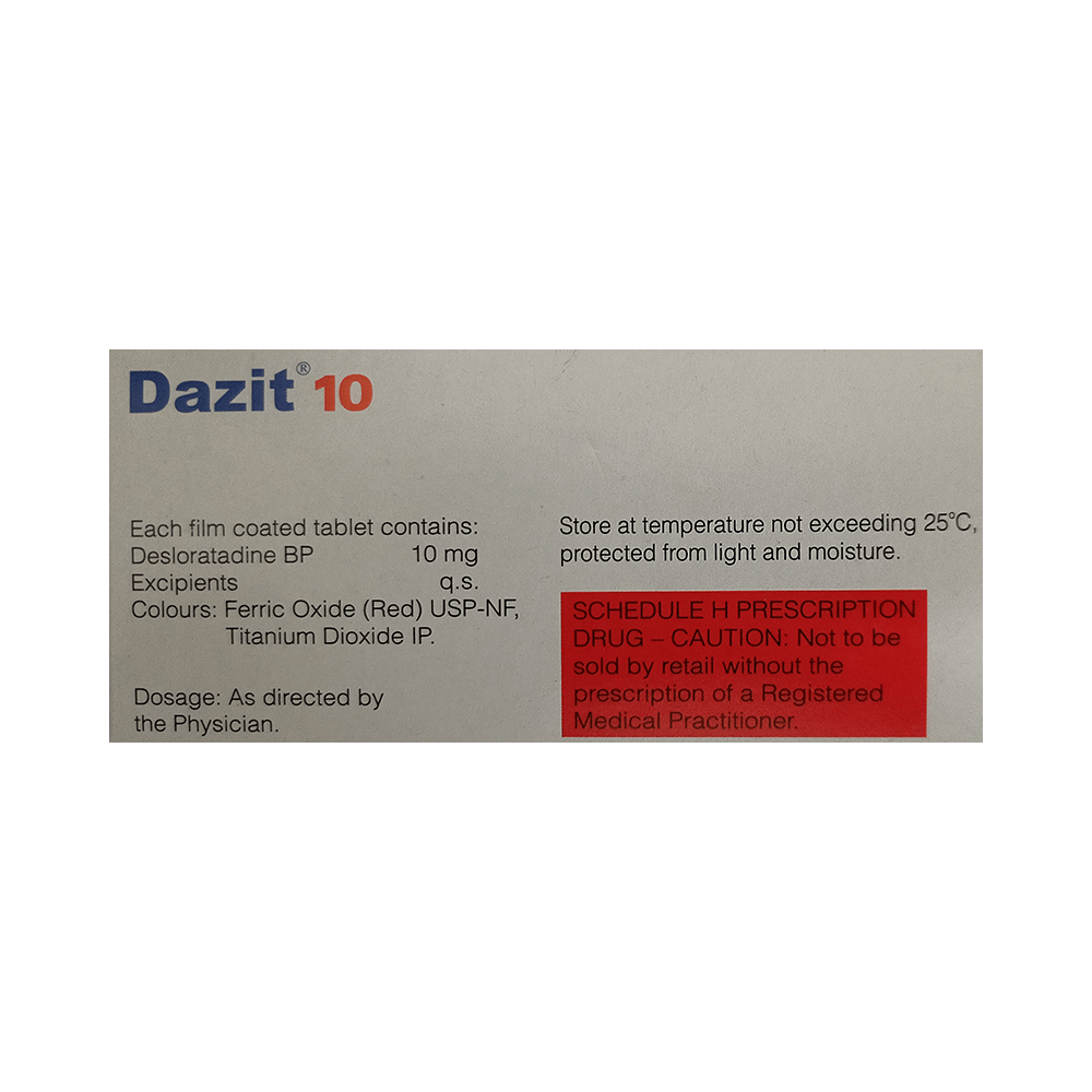 In Treatment of Allergic conditionsdaZIT 10 Tablet provides relief from symptoms such as blocked or runny nose, sneezing, and itchy or watery eyes. This will make it easier for you to go about your daily activities. It can also give relief from allergic reactions after insect bites and symptoms of hives and eczema such as rash, swelling, itching, and irritation. This will improve the appearance of your skin and you may find that your mood and self-confidence improve as well. It rarely has any serious side effects and you may only need to take it on days you have symptoms. Moreover, daZIT 10 Tablet may make you feel less sleepy as compared to other antihistamine medicines. If you are taking it to prevent getting symptoms you should use it regularly to get the most benefit.