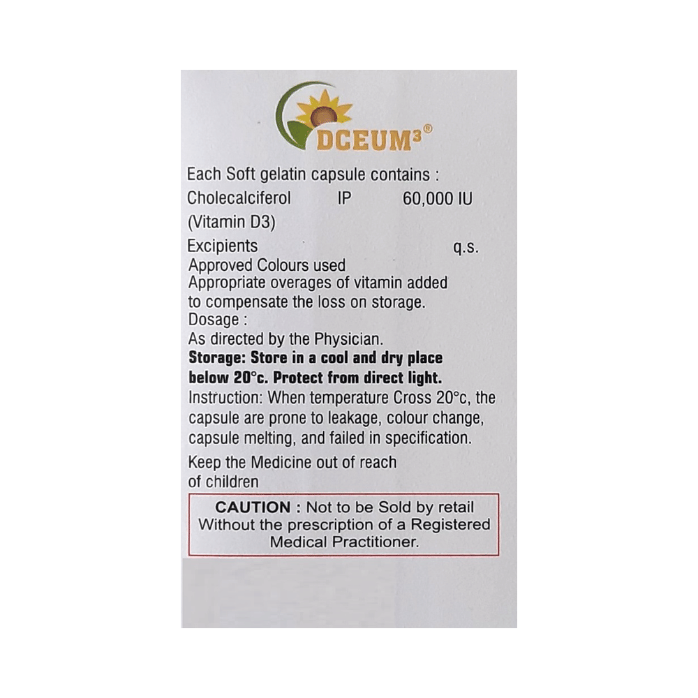 Dceum 3 Softgel Capsule is a form of vitamin D. It raises vitamin D levels in your blood. This, in turn, increases calcium levels in your blood by helping you absorb more calcium from food.