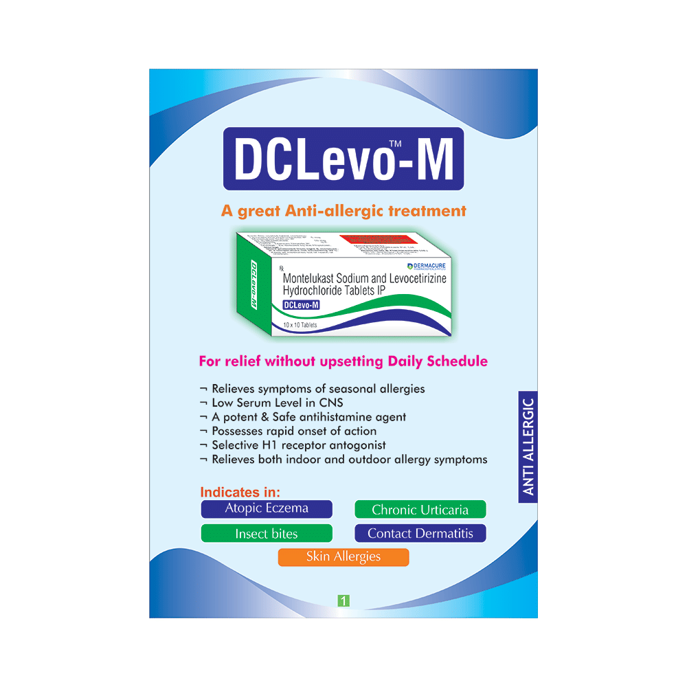 Dclevo-M Tablet is a combination medicine used in the treatment of allergic symptoms such as runny nose, stuffy nose, sneezing, itching, swelling, watery eyes and congestion or stuffiness. It also reduces inflammation in the airways and make breathing easier. Dclevo-M Tablet is taken with or without food in a dose and duration as advised by the doctor. The dose you are given will depend on your condition and how you respond to the medicine. You should keep taking this medicine for as long as your doctor recommends. If you stop treatment too early your symptoms may come back and your condition may worsen. Let your healthcare team know about all other medications you are taking as some may affect, or be affected by this medicine.The most common side effects are nausea, diarrhea, vomiting, dryness in the mouth, headache, skin rash, flu-like symptoms, and fatigue. Most of these are temporary and usually resolve with time. Contact your doctor straight away if you are at all concerned about any of these side effects. This medicine may cause dizziness and sleepiness, so do not drive or do anything that requires mental focus until you know how this medicine affects you. Avoid drinking alcohol while taking this medicine as it can worsen your sleepiness.Never support self-medication or recommend your medicine to another person. It is beneficial to have plenty of fluids while taking this medication. Before you start taking this medicine it is important to inform your doctor if you are suffering from kidney disease.