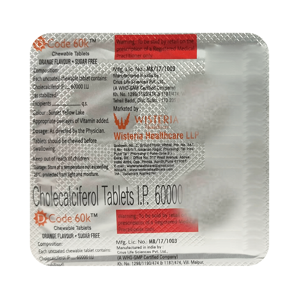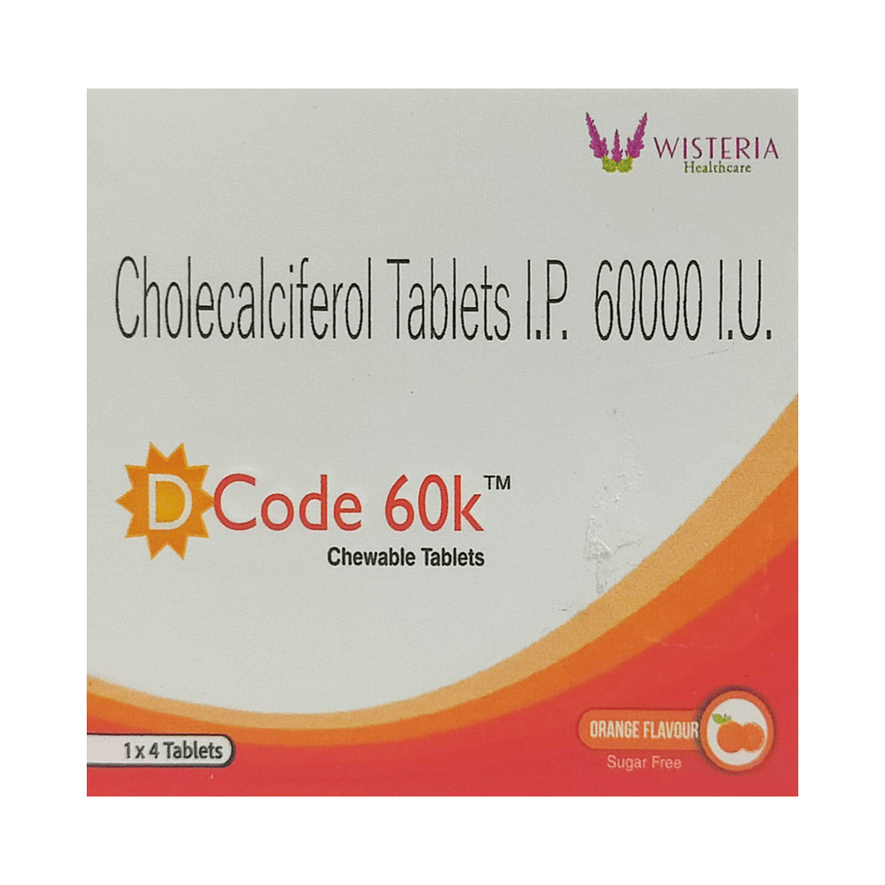 Dcode 60K Chewable Tablet Orange Sugar Free is used in the treatment of vitamin D deficiency and osteoporosis. It helps the body to absorb calcium. Calcium is essential for maintaining strong and healthy bones. It is used when your diet does not provide enough calcium. Dcode 60K Chewable Tablet Orange Sugar Free should be taken as directed by your doctor. It is best taken with or after food, as this helps your body absorb it, and you should take it regularly to get the most benefits. If you are using it to treat osteoporosis, you will also be prescribed other medicines. This medicine may be only part of a complete treatment program that includes making changes to your diet and taking calcium and vitamin supplements. Learn about the foods you should eat to ensure you get enough calcium and vitamin D.Dcode 60K Chewable Tablet Orange Sugar Free has few side effects, and none are common. If you take too much, you may feel weakness, muscle pain, or a metallic taste in your mouth. If you experience any such side effects, speak with your doctor. They may be able to help you reduce or treat the symptoms.Before taking this medicine, tell your doctor if you have high calcium levels in your blood or if you have any heart, kidney, or liver disease. Some other medicines can decrease the absorption of vitamin D3, so let your doctor know about all the other medicines you are taking to make sure you are safe. This medicine may help during pregnancy when your body needs more vitamin D, but too much could harm your baby. Discuss it with your doctor.
