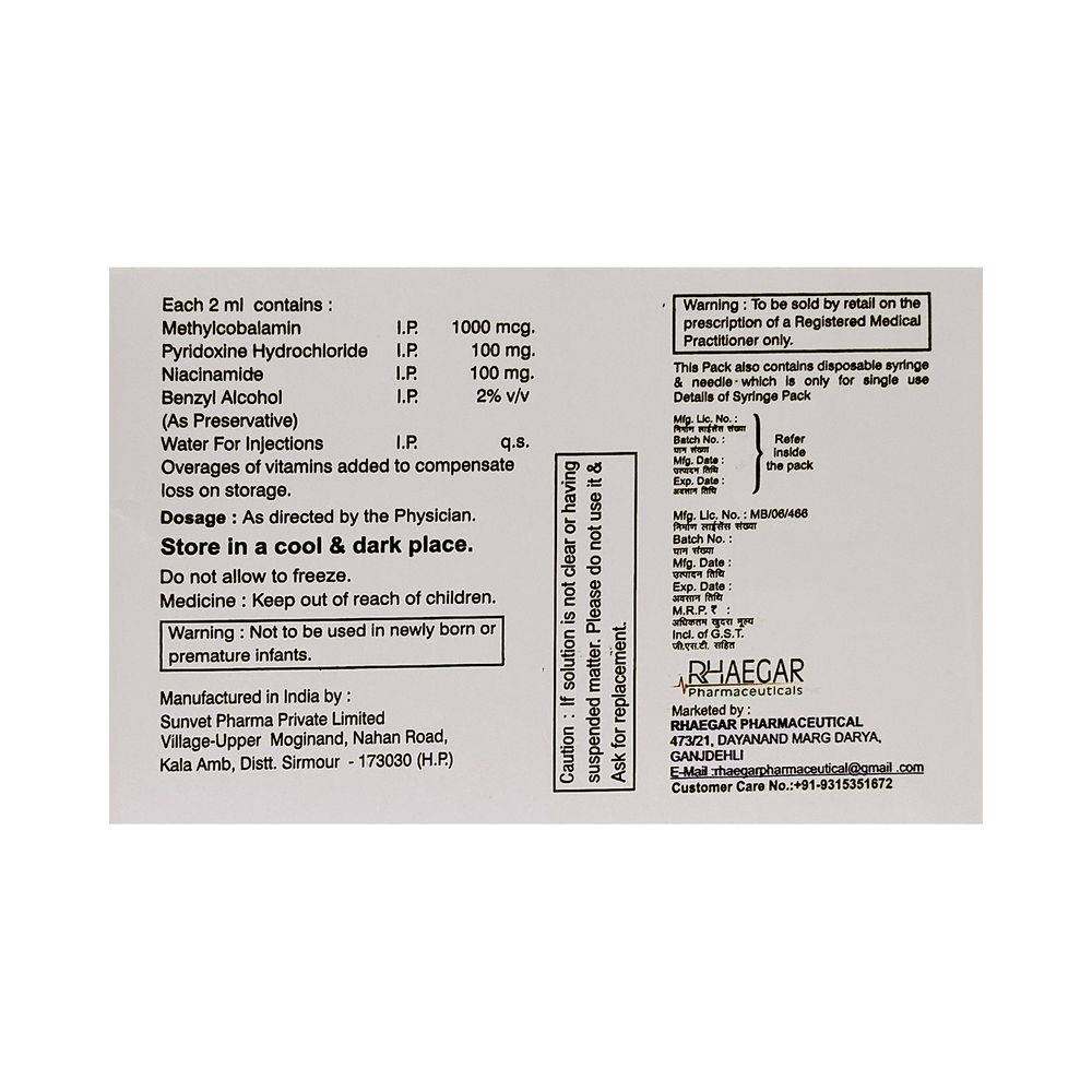 Salt Composition: Methylcobalamin (1000mcg/2ml) + Niacinamide (100mg/2ml) + Vitamin B6 (Pyridoxine) (100mg/2ml)